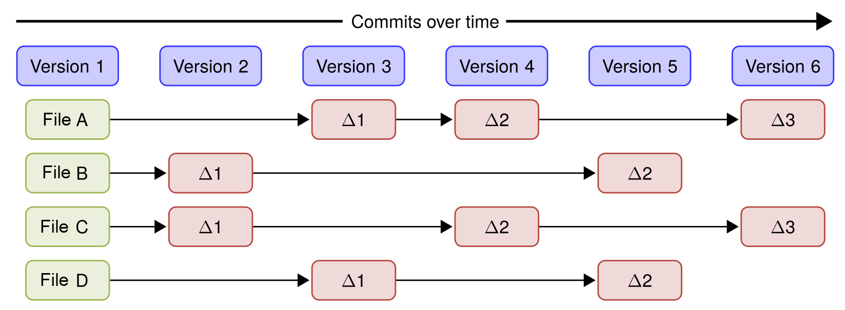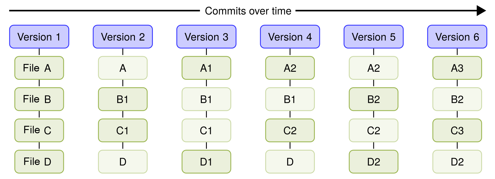 Git is different: Instead of the regular file and patches list, Git records a snapshot of all the files tracked by Git and their paths relative to the repository root---that is, the files tracked by Git in the filesystem tree. Each commit in Git records the full tree state. If a file does not change between commits, Git will not store the file again. Instead, Git stores a link to the file. This is shown in the diagram below where you see how the files will be after every commit/version.