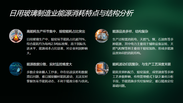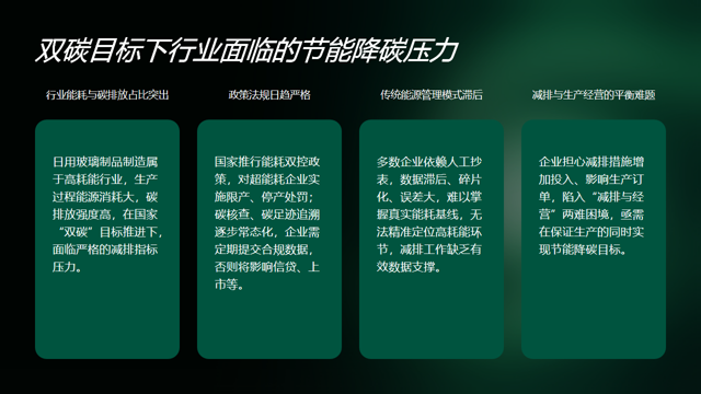 在国家"双碳"目标推进的大背景下,日用玻璃制品制造行业面临着巨大的节能降碳压力。其一,该行业属于高耗能领域,生产能耗大、碳排放强,减排指标压力与日俱增。其二,政策法规日益严格,能耗双控政策下超能耗企业会被处罚,碳核查常态化也对企业数据合规性提出挑战。