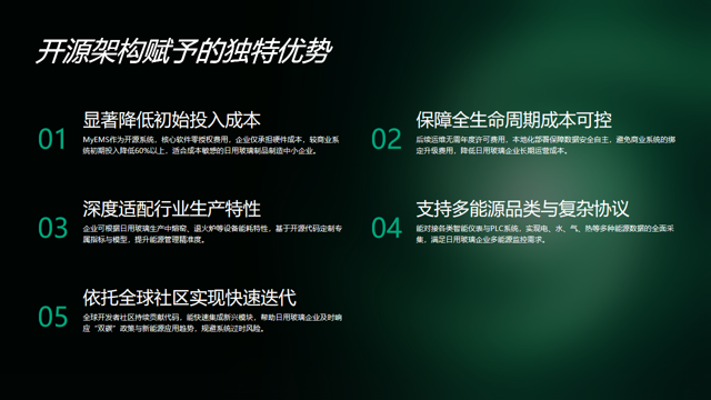 前面我们了解了MyEMS在能耗分析、节能优化、碳排放核算等多方面的功能。本页将聚焦其助力日用玻璃制造的关键价值。MyEMS凭借多方面优势为企业带来诸多益处。后续我们还会探讨它如何破解管理难题、体现开源优势等。