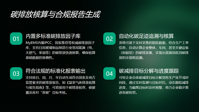 MyEMS在碳排放核算与合规报告生成方面提供全方位支持。其内置多标准的权威碳排放因子库,涵盖IPCC、国家推荐等标准,可对日用玻璃行业常用能源碳排放快速换算,保证核算基础数据准确。