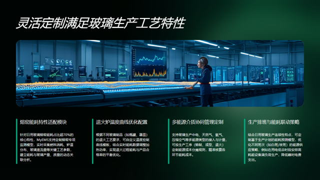能效对标与节能潜力诊断基于历史数据自动生成单位玻璃制品能耗指标,与行业基准值对标,识别节能潜力环节。如某企业通过系统发现生产线待机能耗占比高,优化后年节电超30万元。