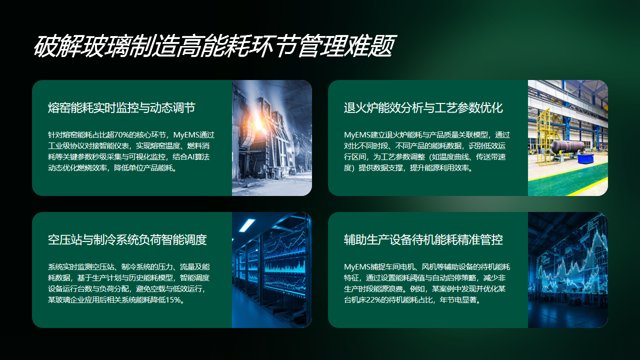 其次是某玻璃厂,MyEMS监测发现关键设备存在电机能效低和非生产时段空转问题。通过预警和优化建议,企业更换电机、调整启停时间,使设备综合能效提升15%,单条生产线年节电15万度,故障率降低20%,提高了生产效率和稳定性。