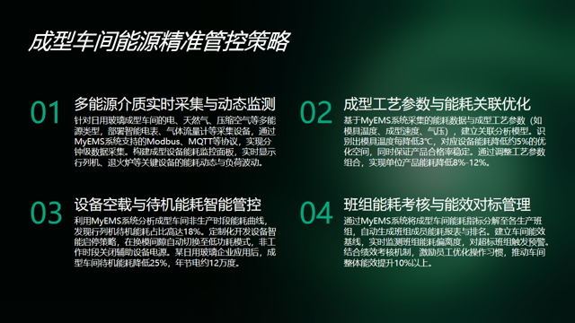 MyEMS系统助力日用玻璃成型车间实现能源精准管控。首先是多能源介质实时采集与动态监测,通过Modbus、MQTT等协议,利用智能电表、气体流量计等设备,实现多能源类型分钟级数据采集,还可构建监控面板,展示关键设备能耗动态与负荷波动。