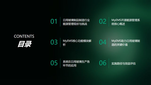 本次演讲将围绕六个方面展开。先分析日用玻璃制品制造行业能源管理现状与挑战,了解行业痛点;接着介绍MyEMS开源能源管理系统核心概述,明确其定位与优势;再解析核心功能模块,阐述助力关键价值;随后说明系统在各生产环节应用;最后探讨实施路径与效益评估,为企业能源管理提供全面方案。