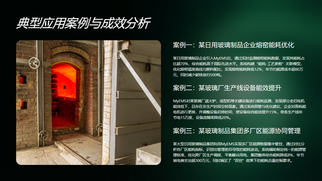 接下来为大家分享MyEMS系统在日用玻璃行业的三个典型应用案例及其成效。首先是某日用玻璃制品企业,引入MyEMS后发现熔窑能耗占比超70%且高于国际先进水平。系统构建关联模型优化参数,使熔窑能耗降低12%,年节约成本超80万元,还减少碳排放约500吨,实现了经济与环保双赢。