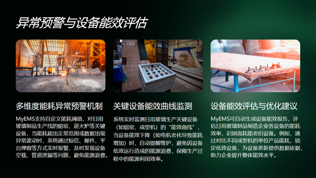 MyEMS在异常预警与设备能效评估方面拥有显著优势。其具备多维度能耗异常预警机制,能够让企业自定义能耗阈值,对熔窑、退火炉等关键设备实时监控。一旦能耗超出正常范围或数据异常波动,系统会通过多种方式及时报警,助企业发现设备空载、管道泄漏等问题,避免能源浪费。