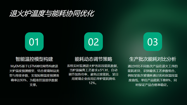 MyEMS在退火炉温度与能耗协同优化上有显著成效。首先,基于LSTM神经网络构建智能温控模型,结合玻璃制品类型与厚度参数,将短期温度预测准确率提升至93%,为精准控温提供了坚实的数据依据。这意味着可依据精确的温度预测合理调控退火炉,避免能源浪费。