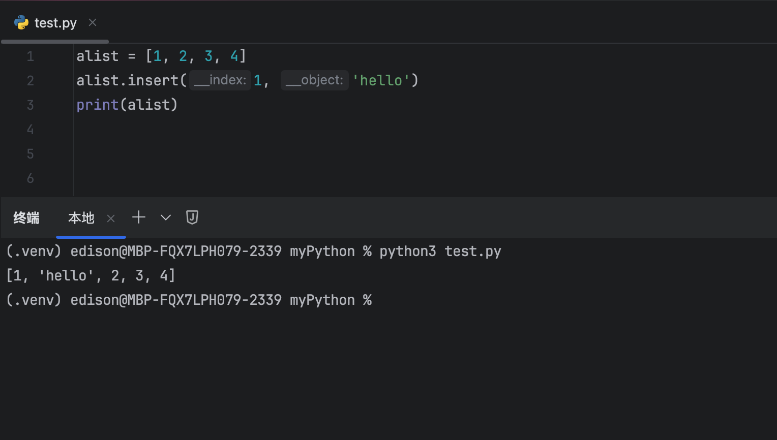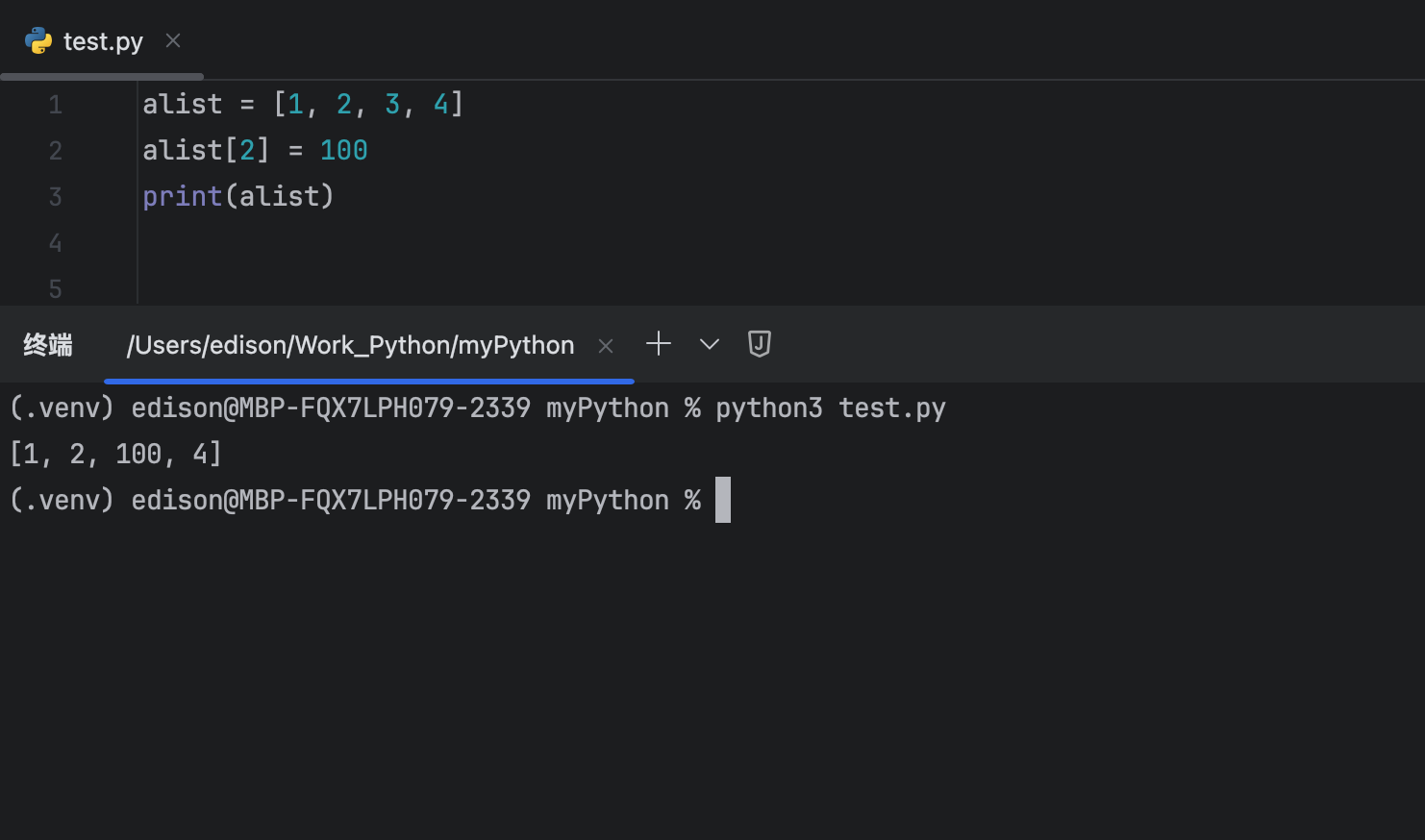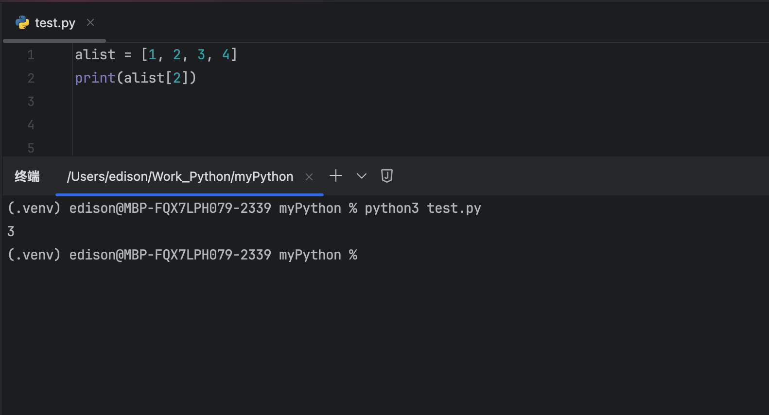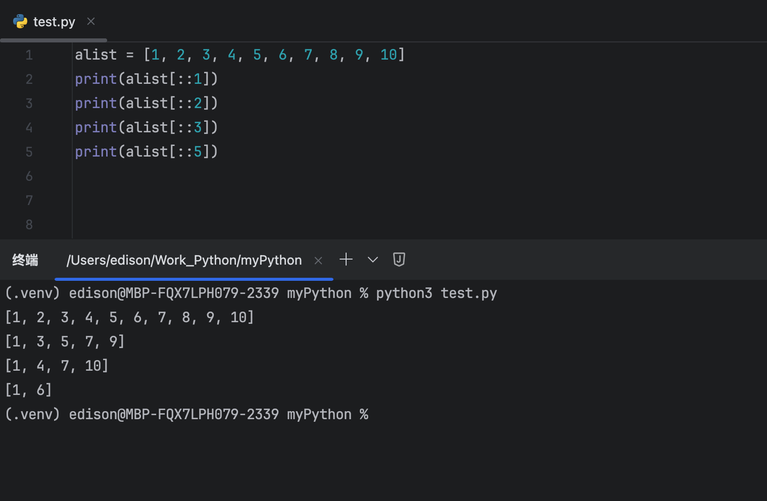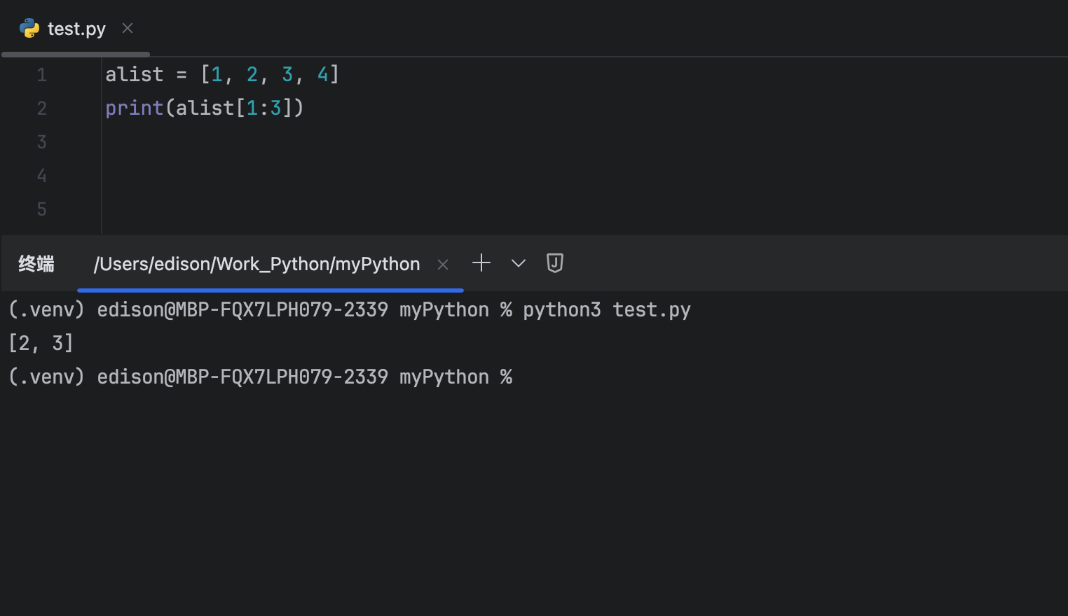 其中:alist[1:3] 中的 1:3 表示的是 [1, 3) 这样的由下标构成的前闭后开区间。也就是从下标为 1 的元素开始(2),到下标为 3 的元素结束(4),但是不包含下标为 3 的元素。所以最终结果只有 2, 3