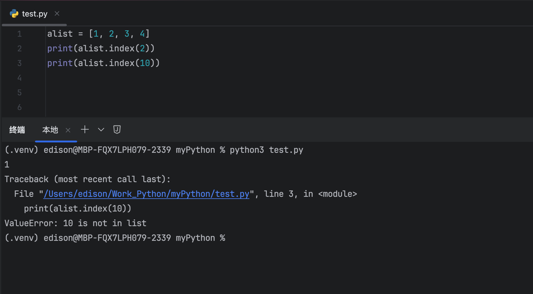 index方法,查找元素在列表中的下标。返回值是一个整数。如果元素不存在,则会抛出异常。
