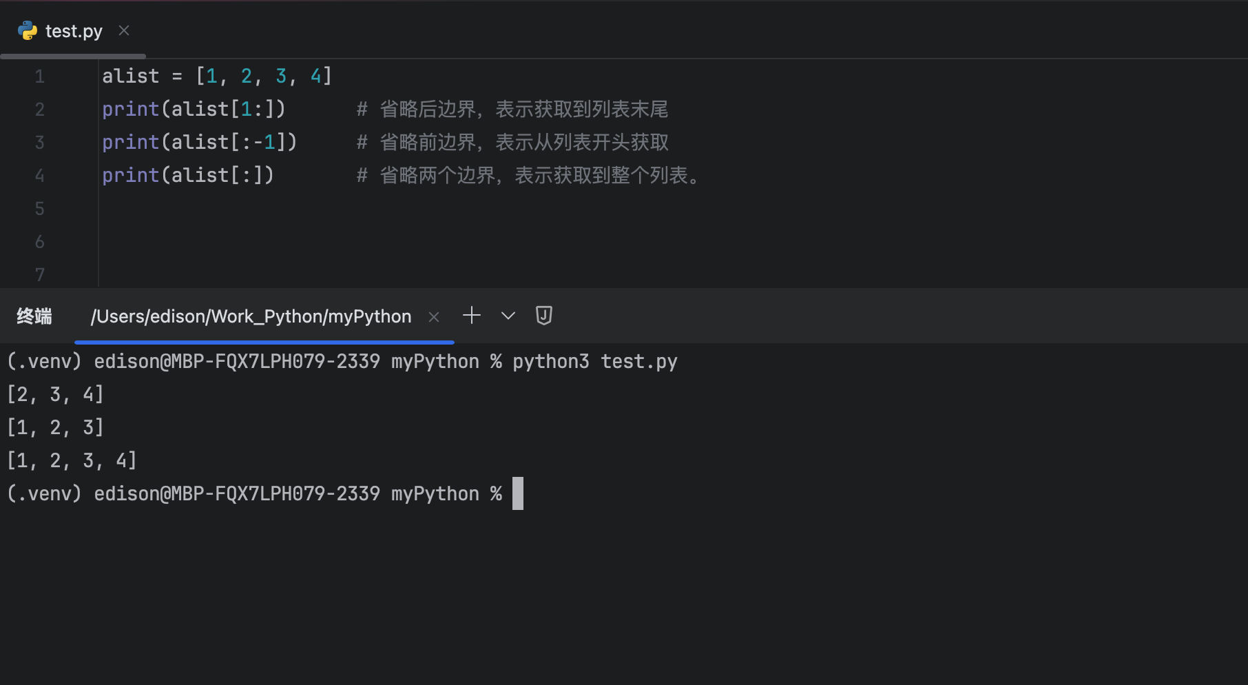 print(alist[1:]) # 省略后边界,表示获取到列表末尾