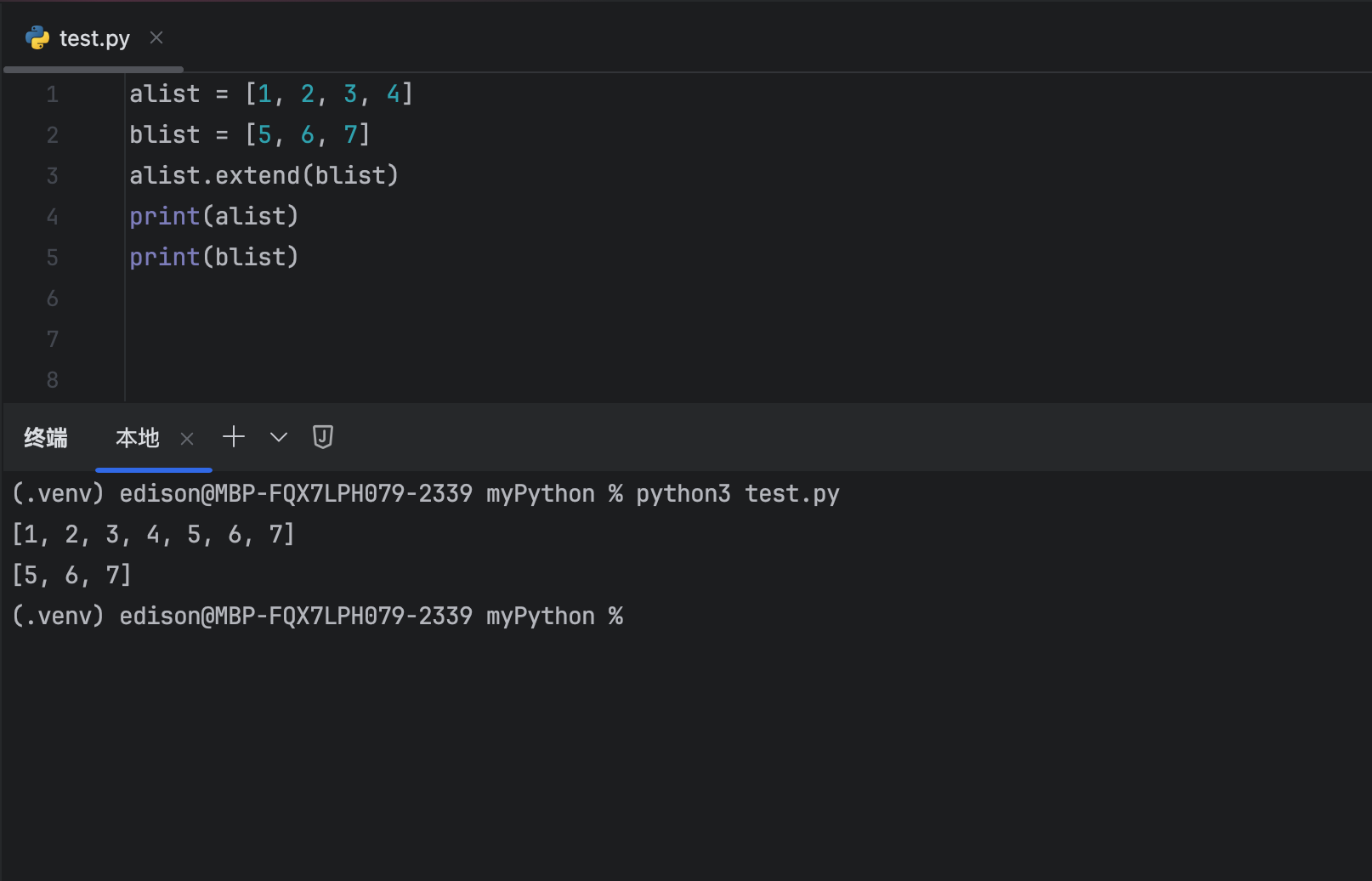 其中 a.extend(b),是把 b 中的内容拼接到 a 的末尾,不会修改 b,但是会修改 a。