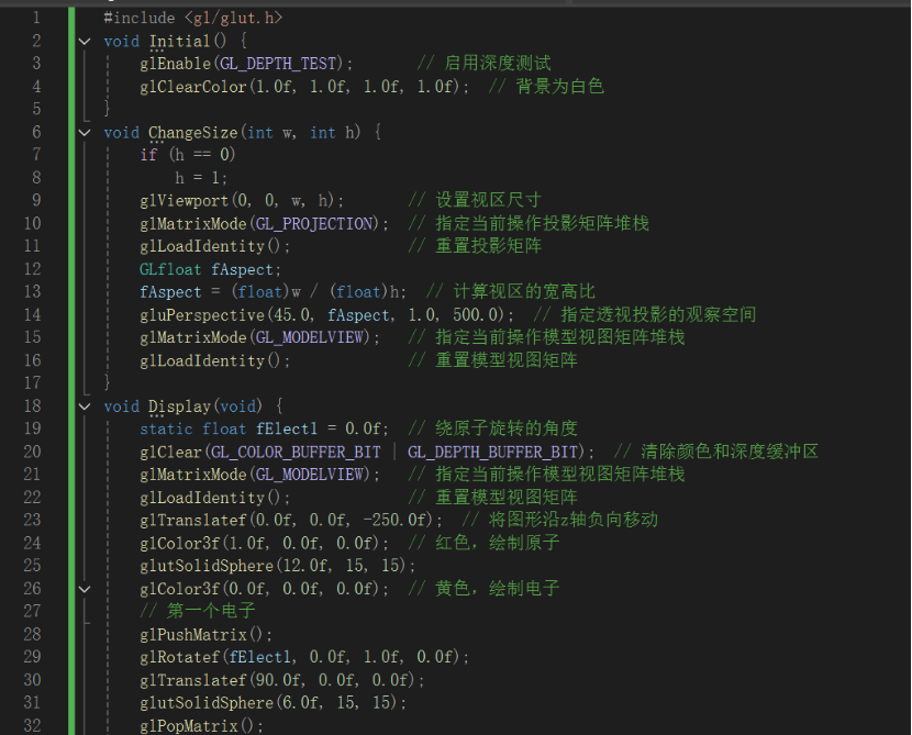 本次分子模型实验,让我对 OpenGL 中三维动画和深度测试的应用有了深入认识。通过 GLUT 库的定时器回调函数,不断更新电子旋转的角度参数,实现了电子绕原子旋转的动态效果,理解了动画本质是 "一帧帧静态图像快速切换" 的原理。深度测试的启用则解决了三维图形的遮挡问题,让我清晰认识到 z 值在判断像素深度、实现真实空间遮挡中的关键作用。双缓存技术有效消除了动画闪烁,使视觉体验更加平滑。矩阵变换的灵活运用(模型视图变换、投影变换)让三维图形的空间定位和透视效果得以准确呈现,窗口整形函数的使用也保证了模型在窗口缩放时的自适应显示。这次实验不仅巩固了我对 OpenGL 基本功能的掌握,更让我对三维图形的动态交互和真实感表现有了实践层面的理解,为后续复杂三维场景开发积累了经验。