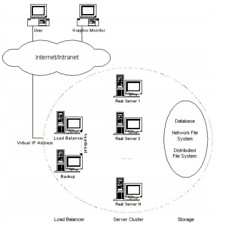 使用LVS架设的服务器集群系统有三个部分组成:最前端的负载均衡层,用Load Balancer表示,中间的服务器群组层,用Server Cluster表示,最底端的数据共享存储层,用Storage表示,在用户看来,所有的内部应用都是透明的,用户只是在使用一个虚拟服务器提供的高性能服务