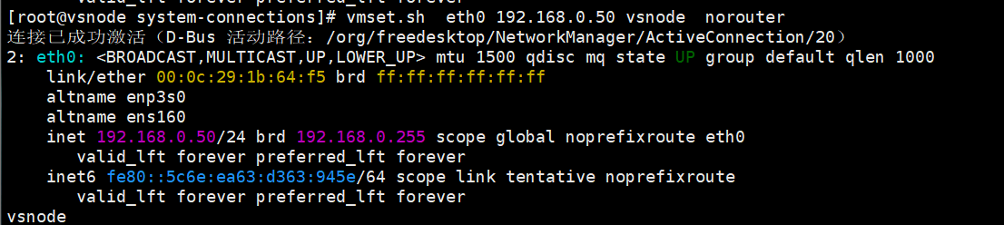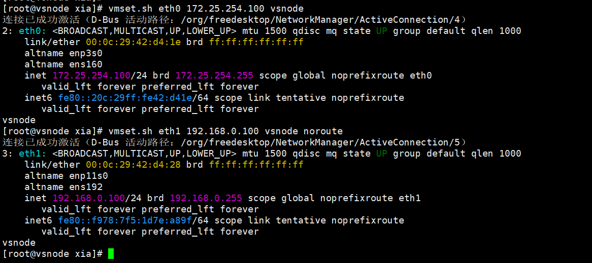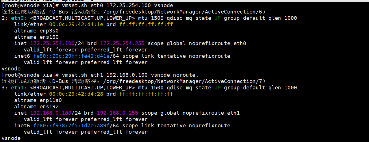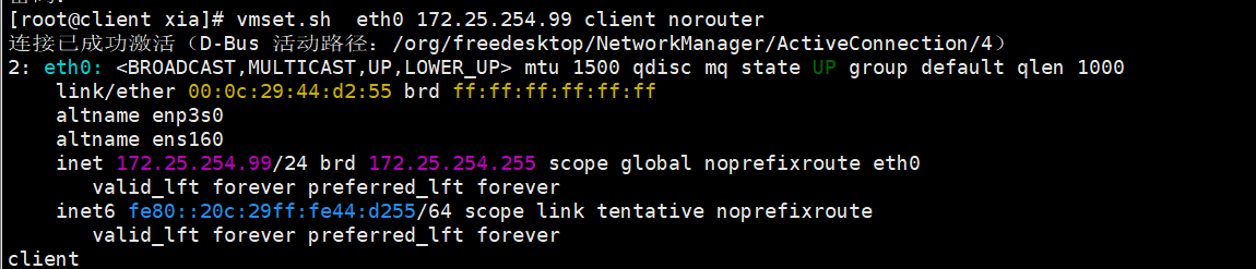 root@vsnode system-connections\]# nmcli connection reload 重启服务 \[root@vsnode system-connections\]# nmcli connection up eth0 激活网卡 连接已成功激活(D-Bus 活动路径:/org/freedesktop/NetworkManager/ActiveConnection/18) \[root@vsnode system-connections\]# nmcli connection up lo 连接已成功激活(D-Bus 活动路径:/org/freedesktop/NetworkManager/ActiveConnection/19) \[root@vsnode system-connections\]# route -n Kernel IP routing table Destination Gateway Genmask Flags Metric Ref Use Iface 0.0.0.0 192.168.0.100 0.0.0.0 UG 100 0 0 eth0 127.0.0.0 0.0.0.0 255.0.0.0 U 30 0 0 lo 192.168.0.0 0.0.0.0 255.255.255.0 U 100 0 0 eth0  客户端 配IP  \[root@client xia\]# vim /etc/NetworkManager/system-connections/eth0.nmconnection \[connection