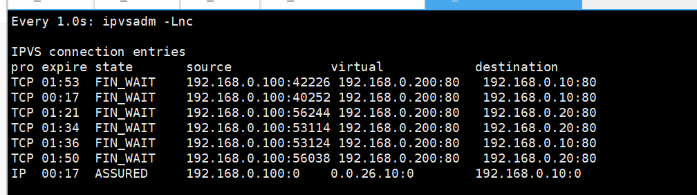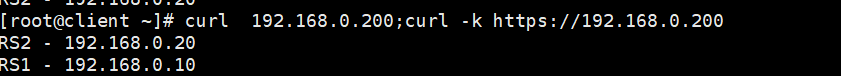 root@rs2 system-connections\]# nmcli connection reload \[root@rs2 system-connections\]# nmcli connection up lo 连接已成功激活(D-Bus 活动路径:/org/freedesktop/NetworkManager/ActiveConnection/9) \[root@rs2 system-connections\]# echo 1 \> /proc/sys/net/ipv4/conf/all/arp_ignore设置所有网卡的 arp_ignore 参数为 1,让服务器只响应目标 IP 是本机网卡配置的 IP 的 ARP 请求。 \[root@rs2 system-connections\]# echo 1 \> /proc/sys/net/ipv4/conf/lo/arp_ignore单独给回环网卡(lo)设置 arp_ignore=1,强化对 VIP 的 ARP 响应限制(因为 LVS DR 模式下 VIP 通常配置在 lo 网卡上)。 \[root@rs2 system-connections\]# echo 2 \> /proc/sys/net/ipv4/conf/lo/arp_announce设置回环网卡的 arp_announce 参数为 2,让服务器发送 ARP 包时,只使用目标网段匹配的网卡 IP 作为源 IP,不暴露 VIP。 \[root@rs2 system-connections\]# echo 2 \> /proc/sys/net/ipv4/conf/all/arp_announce让所有网卡生效 arp_announce=2,全局限制 ARP 包的源 IP 选择,避免 VIP 被对外暴露 ## 四、利用火墙标记解决轮询错误 ### 1.在rs主机中同时开始http和https两种协议 #在RS1和RS2中开启https RS1 \[root@RS1 \~\]# dnf install mod_ssl -y \[root@RS1 \~\]# systemctl restart httpd \[root@RS1\~\]# systemctl restart httpd RS2 \[root@RS2 \~\]# dnf install mod_ssl -y \[root@RS2 \~\]# systemctl restart httpd \[root@RS2\~\]# systemctl restart httpd ### 2.在vsnode中添加https的轮询策略 \[root@vsnode \~\]# ipvsadm -A -t 192.168.0.200:80 -s rr 创建 80 端口虚拟服务 \[root@vsnode \~\]# ipvsadm -a -t 192.168.0.200:80 -r 192.168.0.20 -g 添加 80 端口后端 RS2 \[root@vsnode \~\]# ipvsadm -a -t 192.168.0.200:80 -r 192.168.0.10 -g添加 80 端口后端 RS1 \[root@vsnode \~\]# ipvsadm -A -t 192.168.0.200:443 -s rr创建 443 端口虚拟服务 \[root@vsnode \~\]# ipvsadm -a -t 192.168.0.200:443 -r 192.168.0.10:443 -g添加 443 端口后端 RS1 \[root@vsnode \~\]# ipvsadm -a -t 192.168.0.200:443 -r 192.168.0.20:443 -g添加 443 端口后端 RS2 \[root@vsnode \~\]# ipvsadm -Ln IP Virtual Server version 1.2.1 (size=4096) Prot LocalAddress:Port Scheduler Flags -\> RemoteAddress:Port Forward Weight ActiveConn InActConn TCP 192.168.0.200:80 rr -\> 192.168.0.10:80 Route 1 0 0 -\> 192.168.0.20:80 Route 1 0 0 TCP 192.168.0.200:443 rr -\> 192.168.0.10:443 Route 1 0 0 -\> 192.168.0.20:443 Route 1 0 0 ### 3.轮询错误展示 \[root@client \~\]# curl 192.168.0.200;curl -k https://192.168.0.200 RS2 - 192.168.0.20 RS2 - 192.168.0.20 解决方案:使用火墙标记访问vip的80和443的所有数据包,设定标记为6666,然后对此标记进行负载 \[root@vsnode \~\]# iptables -t mangle -A PREROUTING -d 192.168.0.200 -p tcp -m multiport --dports 80,443 -j MARK --set-mark 6666给 80/443 流量打 6666 标记 \[root@vsnode \~\]# ipvsadm -A -f 6666 -s rr创建基于 6666 标记的 LVS 虚拟服务 \[root@vsnode \~\]# ipvsadm -a -f 6666 -r 192.168.0.10 -g添加后端节点 192.168.0.10(DR 模式) \[root@vsnode \~\]# ipvsadm -a -f 6666 -r 192.168.0.20 -g添加后端节点 192.168.0.20(DR 模式) 测试  ## 五、利用持久连接实现会话粘滞 ### 1.设定ipvs调度策略 \[root@vsnode \~\]# iptables -t mangle -A PREROUTING -d 192.168.0.100 -p tcp -m multiport --dports 80,443 -j MARK --set-mark 6666 对所有访问 192.168.0.100 的 80/443 端口流量打「6666」标记,然后 LVS 对带这个标记的流量做「轮询 + 1 秒会话保持」的 DR 模式负载均衡。 \[root@vsnode \~\]# ipvsadm -A -f 6666 -s rr -p 1 \[root@vsnode \~\]# ipvsadm -Ln 告诉 LVS:要处理 6666 标记的流量,用轮询方式 IP Virtual Server version 1.2.1 (size=4096) Prot LocalAddress:Port Scheduler Flags -\> RemoteAddress:Port Forward Weight ActiveConn InActConn TCP 192.168.0.200:80 rr FWM 6666 rr -\> 192.168.0.10:0 Route 1 0 2 -\> 192.168.0.20:0 Route 1 0 0 ### 2.测试  ### 3.观察
