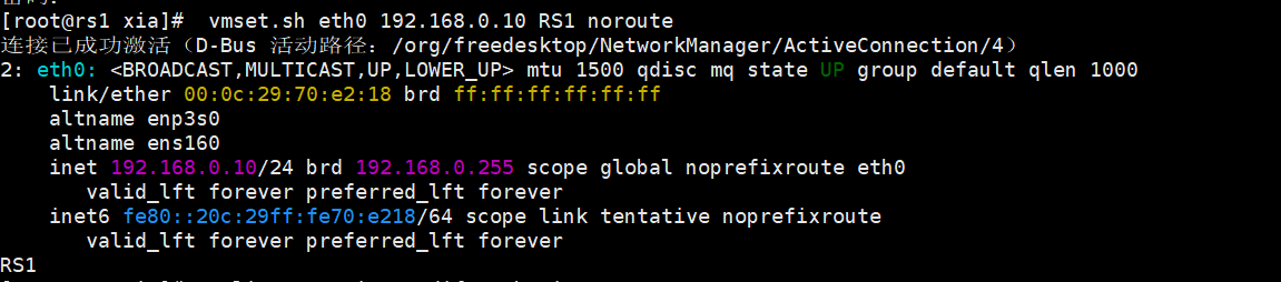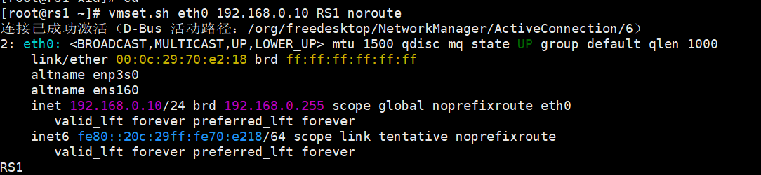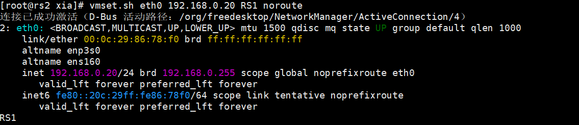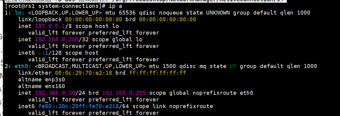 root@client xia\]# nmcli connection reload \[root@client xia\]# nmcli connection up eth0 连接已成功激活(D-Bus 活动路径:/org/freedesktop/NetworkManager/ActiveConnection/5) \[root@client xia\]# route -n Kernel IP routing table Destination Gateway Genmask Flags Metric Ref Use Iface 0.0.0.0 172.25.254.100 0.0.0.0 UG 100 0 0 eth0 172.25.254.0 0.0.0.0 255.255.255.0 U 100 0 0 eth0 验证 \[root@client xia\]# ping 192.168.0.200 PING 192.168.0.200 (192.168.0.200) 56(84) 比特的数据。 64 比特,来自 192.168.0.200: icmp_seq=1 ttl=63 时间=1.36 毫秒 64 比特,来自 192.168.0.200: icmp_seq=2 ttl=63 时间=1.29 毫秒 64 比特,来自 192.168.0.200: icmp_seq=3 ttl=63 时间=1.84 毫秒 --- 192.168.0.200 ping 统计 --- 已发送 3 个包, 已接收 3 个包, 0% packet loss, time 2003ms rtt min/avg/max/mdev = 1.285/1.494/1.840/0.246 ms RS1 配IP  \[root@rs1 \~\]# nmcli connection modify eth0 ipv4.gateway 192.168.0.100 \[root@rs1 \~\]# nmcli connection reload \[root@rs1 \~\]# nmcli connection up eth0 连接已成功激活(D-Bus 活动路径:/org/freedesktop/NetworkManager/ActiveConnection/7) \[root@rs1 \~\]# route -n Kernel IP routing table Destination Gateway Genmask Flags Metric Ref Use Iface 0.0.0.0 192.168.0.100 0.0.0.0 UG 100 0 0 eth0 192.168.0.0 0.0.0.0 255.255.255.0 U 100 0 0 eth0 \[root@rs1 \~\]# cd /etc/NetworkManager/system-connections/ \[root@rs1 system-connections\]# cp -p eth0.nmconnection lo.nmconnection \[root@rs1 system-connections\]# vim lo.nmconnection \[connection