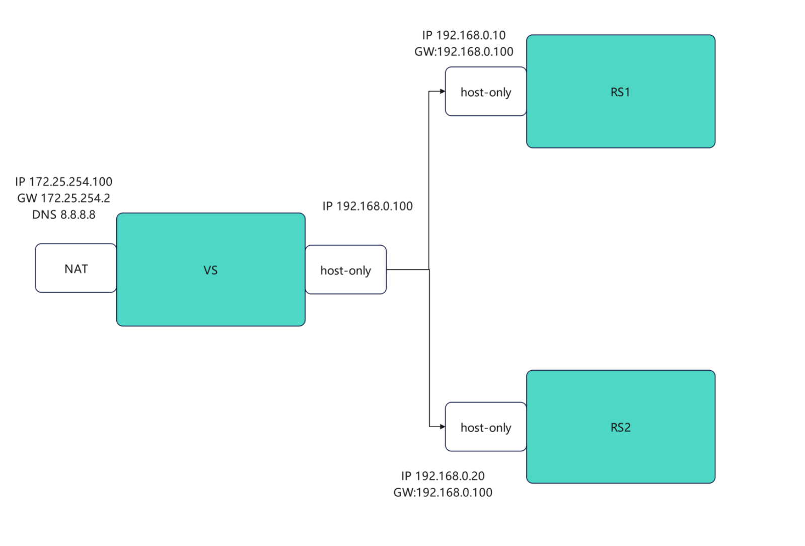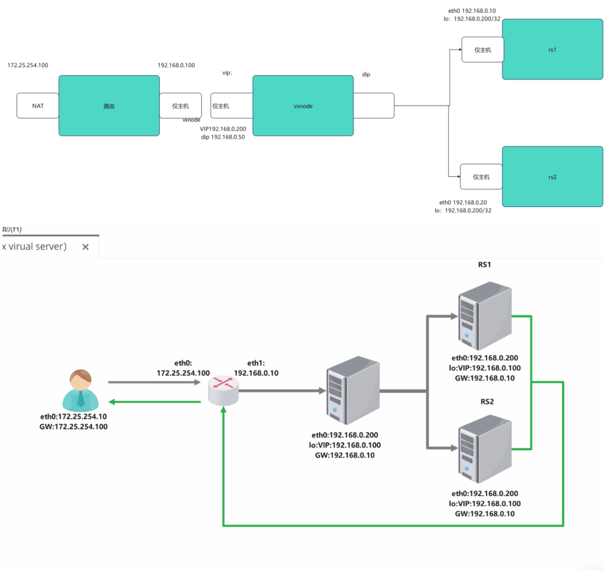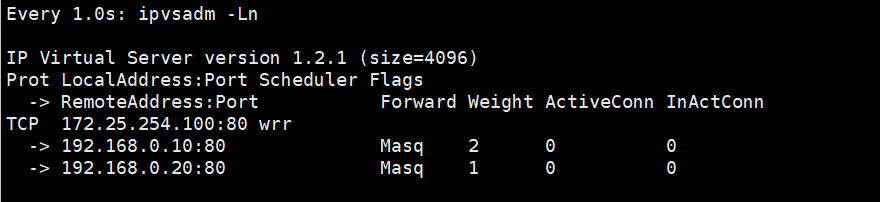 root@rs1 xia\]# nmcli connection modify eth0 ipv4.gateway 192.168.0.100 给网卡 eth0 永久设置 默认网关:192.168.0.100 \[root@rs1 xia\]# nmcli connection reload 让 NetworkManager 重新加载配置 \[root@rs1 xia\]# nmcli connection up eth0 重新激活 eth0,让新网关真正生效 连接已成功激活(D-Bus 活动路径:/org/freedesktop/NetworkManager/ActiveConnection/5) \[root@rs1 xia\]# route -n 查看当前系统内核路由表(看网关、网段、走哪个网卡) Kernel IP routing table Destination Gateway Genmask Flags Metric Ref Use Iface 0.0.0.0 192.168.0.100 0.0.0.0 UG 100 0 0 eth0 192.168.0.0 0.0.0.0 255.255.255.0 U 100 0 0 eth0 RS2  #设定访问业务真实数据 \[root@RS1 \~\]# dnf install httpd -y \[root@RS1 \~\]# systemctl enable --now httpd \[root@RS1 \~\]# echo RS1 - 192.168.0.10 \> /var/www/html/index.html \[root@rs2 xia\]# nmcli connection modify eth0 ipv4.gateway 192.168.0.100 给网卡 eth0 永久设置 默认网关:192.168.0.100 \[root@rs2 xia\]# nmcli connection reload 让 NetworkManager 重新加载配置 \[root@rs2 xia\]# nmcli connection up eth0 重新激活 eth0,让新网关真正生效 连接已成功激活(D-Bus 活动路径:/org/freedesktop/NetworkManager/ActiveConnection/5) \[root@rs2 xia\]# route -n 查看当前系统内核路由表(看网关、网段、走哪个网卡) Kernel IP routing table Destination Gateway Genmask Flags Metric Ref Use Iface 0.0.0.0 192.168.0.100 0.0.0.0 UG 100 0 0 eth0 192.168.0.0 0.0.0.0 255.255.255.0 U 100 0 0 eth0 #设定访问业务真实数据 \[root@RS2 \~\]# dnf install httpd -y \[root@RS2 \~\]# systemctl enable --now httpd \[root@RS2\~\]# echo RS1 - 192.168.0.20 \> /var/www/html/index.html ### 2.验证 #在vs机上验证 \[root@vsnode xia\]# curl 192.168.0.10 RS1 - 192.168.0.10 \[root@vsnode xia\]# curl 192.168.0.20 RS2 - 192.168.0.20 ### 3.NAT模式实现方法 #在vs机子上操作 #1,开启内核路由功能 \[root@vsnode xia\]# echo net.ipv4.ip_forward=1 \>\> /etc/sysctl.conf 永久开启 IPv4 转发 \[root@vsnode xia\]# sysctl -p 立即加载 /etc/sysctl.conf 里的配置,不用重启 net.ipv4.ip_forward = 1 #2.编写策略 \[root@vsnode xia\]# yum install ipvsadm -y \[root@vsnode xia\]# ipvsadm -C 清空服务器上所有已配置的 LVS 规则 \[root@vsnode xia\]# ipvsadm -A -t 172.25.254.100:80 -s wrr创建一个对外提供服务的 LVS 虚拟节点(VIP),指定用 "加权轮询" 算法分发请求。 \[root@vsnode xia\]# ipvsadm -a -t 172.25.254.100:80 -r 192.168.0.10:80 -m -w 1 \[root@vsnode xia\]# ipvsadm -a -t 172.25.254.100:80 -r 192.168.0.20:80 -m -w 1 把后端真实服务器(192.168.0.10/20:80)加入刚才创建的 LVS 虚拟服务,指定用 NAT 模式转发,权重为 1。 \[root@vsnode xia\]# ipvsadm -Ln 查看当前配置好的所有 LVS 规则(验证配置是否生效)。 IP Virtual Server version 1.2.1 (size=4096) Prot LocalAddress:Port Scheduler Flags -\> RemoteAddress:Port Forward Weight ActiveConn InActConn TCP 172.25.254.100:80 wrr -\> 192.168.0.10:80 Masq 1 0 0 -\> 192.168.0.20:80 Masq 1 0 0 测试 \[root@vsnode xia\]# for i in {1..10};do curl 172.25.254.100;done RS2 - 192.168.0.20 RS1 - 192.168.0.10 RS2 - 192.168.0.20 RS1 - 192.168.0.10 RS2 - 192.168.0.20 RS1 - 192.168.0.10 RS2 - 192.168.0.20 RS1 - 192.168.0.10 RS2 - 192.168.0.20 RS1 - 192.168.0.10 #更改权重 \[root@vsnode xia\]# ipvsadm -e -t 172.25.254.100:80 -r 192.168.0.10:80 -m -w 2 \[root@vsnode xia\]# ipvsadm -Ln IP Virtual Server version 1.2.1 (size=4096) Prot LocalAddress:Port Scheduler Flags -\> RemoteAddress:Port Forward Weight ActiveConn InActConn TCP 172.25.254.100:80 wrr -\> 192.168.0.10:80 Masq 2 0 5 -\> 192.168.0.20:80 Masq 1 0 5 测试 \[root@vsnode xia\]# for i in {1..10};do curl 172.25.254.100;done RS2 - 192.168.0.20 RS1 - 192.168.0.10 RS1 - 192.168.0.10 RS2 - 192.168.0.20 RS1 - 192.168.0.10 RS1 - 192.168.0.10 RS2 - 192.168.0.20 RS1 - 192.168.0.10 RS1 - 192.168.0.10 RS2 - 192.168.0.20 ### 4.规则持久化 实验过程可以用过打开另外一个shell的并执行监控命令的方式进行观察 \[root@vsnode \~\]# watch -n 1 ipvsadm -Ln #利用自定义文件进行持久化 \[root@vsnode xia\]# umount /mnt 记得取消挂载硬盘 \[root@vsnode xia\]# ipvsadm-save -n 导出当前系统中所有 LVS 规则 -A -t 172.25.254.100:80 -s wrr -a -t 172.25.254.100:80 -r 192.168.0.10:80 -m -w 2 -a -t 172.25.254.100:80 -r 192.168.0.20:80 -m -w 1  \[root@vsnode xia\]# ipvsadm-save -n \> /mnt/ipvs.rule \[root@vsnode xia\]# ipvsadm -C 清空  \[root@vsnode xia\]# ipvsadm-restore \< /mnt/ipvs.rule  #利用守护进程进行规则持久化 \[root@vsnode xia\]# ipvsadm-save -n \> /etc/sysconfig/ipvsadm \[root@vsnode xia\]# ipvsadm -C  \[root@vsnode xia\]# systemctl enable --now ipvsadm.service Created symlink /etc/systemd/system/multi-user.target.wants/ipvsadm.service → /usr/lib/systemd/system/ipvsadm.service.  ## 三、DR模式实验过程  ### 环境设定 路由器 \[root@vsnode xia\]# systemctl enable --now ipvsadm.service 给 ipvsadm 服务创建开机自启的软链,并立即启动服务 Created symlink /etc/systemd/system/multi-user.target.wants/ipvsadm.service /usr/lib/systemd/system/ipvsadm.service. 说明开机自启的链接已创建,服务启动成功。 \[root@vsnode xia\]# systemctl disable --now ipvsadm.service 删除 ipvsadm 服务的开机自启软链接 Removed "/etc/systemd/system/multi-user.target.wants/ipvsadm.service". \[root@vsnode xia\]# ipvsadm -C #设定ip  #设定内核路由功能 \[root@vsnode xia\]# echo net.ipv4.ip_forward=1 \>\> /etc/sysctl.conf \[root@vsnode xia\]# sysctl -p net.ipv4.ip_forward = 1 #数据转发策略 \[root@vsnode xia\]# iptables -t nat -A POSTROUTING -o eth1 -j SNAT --to-source 192.168.0.100 \[root@vsnode xia\]# iptables -t nat -A POSTROUTING -o eth0 -j SNAT --to-source 172.25.254.100 vsnode 调度器 配IP  \[root@vsnode \~\]# vmset.sh eth0 192.168.0.50 vsnode norouter \[root@vsnode \~\]# vim /etc/NetworkManager/system-connections/eth0.nmconnection \[connection