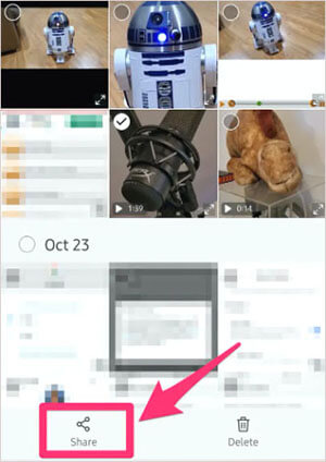 步骤二:选中你想分享的大视频,按住它直到出现分享图标。点击该图标。