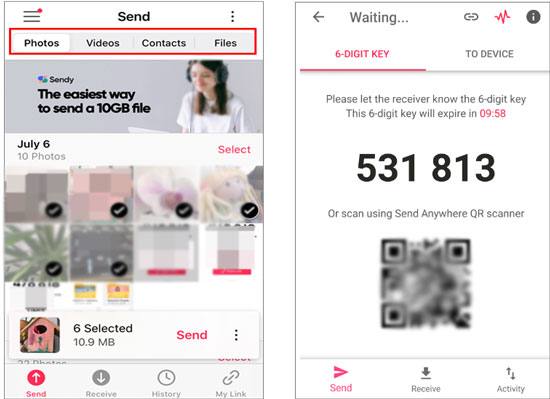 Send Anywhere是一款安装在Android上的第三方应用程序,可让您分享任何您想要的文件。该应用允许您上传高达 50GB 的数据,并在创建链接后与朋友分享。为了确保此功能正常运行,您需要 Wi-Fi 连接以支持大型视频文件的传输。在将长视频发送给朋友之前,您必须向他们发送一个一次性的 6 位数验证码,以建立安全连接。