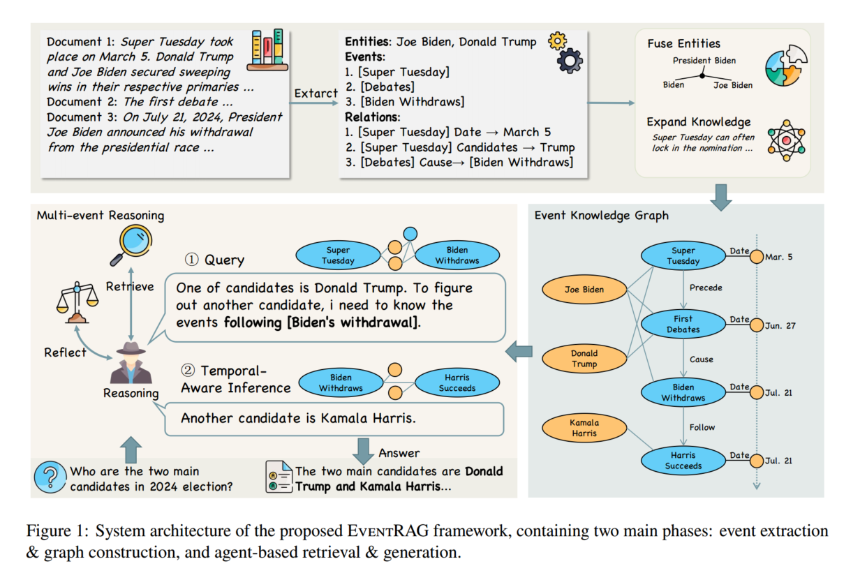 第一阶段,EventRAG将文本分解为一系列事件,将关键事件组件(如参与者和时间标记)作为知识图谱中的节点,同时提取事件间的逻辑关系作为边。