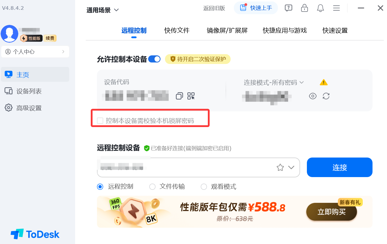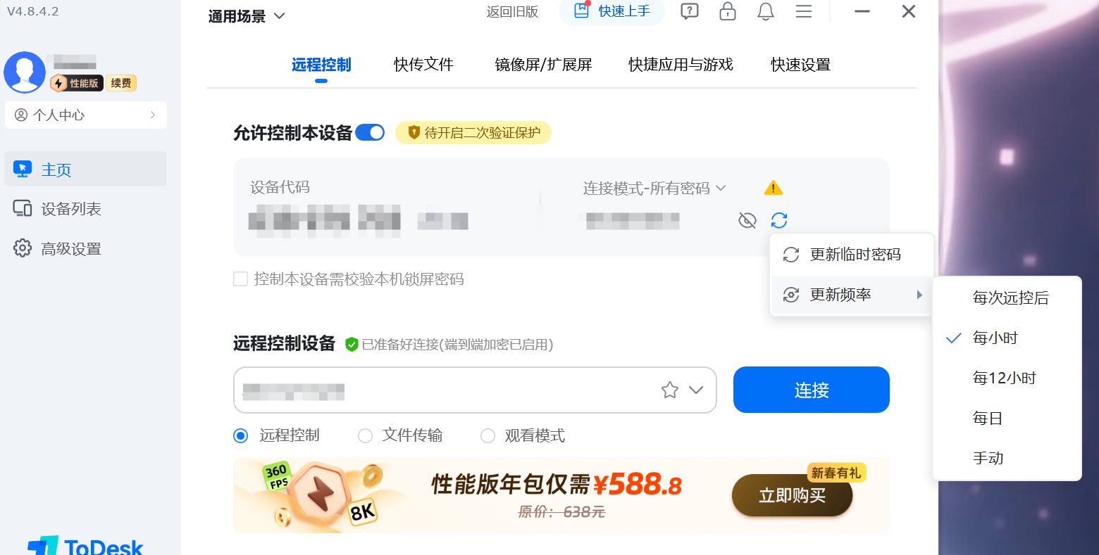 但ToDesk的安全防护远不止于此。它提供了业内最完善的二次验证保护机制。当有新设备尝试连接时,系统会自动向账号绑定的手机发送验证码,只有输入正确的验证码才能完成连接。这个功能在实际测试中表现出色:我故意将设备码和密码泄露给测试账号,结果发现即使拥有正确的凭证,攻击者仍然无法完成连接,因为他们无法获取我手机上的验证码。这种设计有效防止了密码泄露导致的安全风险。