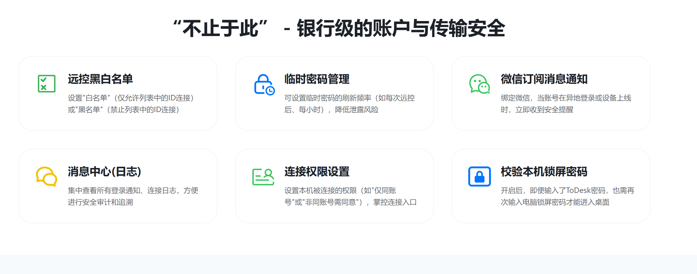 ToDesk 以银行级安全为核心,通过 TLS 1.3 + AES-256 端到端加密保障传输安全,结合多因子认证、可信设备管理筑牢身份防线;同时提供远控黑白名单、临时密码管理、微信安全通知、连接日志审计、精细化权限控制及本机锁屏密码二次校验等特色功能,从准入、传输、审计全链路实现高可靠的远程控制安全防护。接下来我们来逐步的看一下这些核心的安全功能。