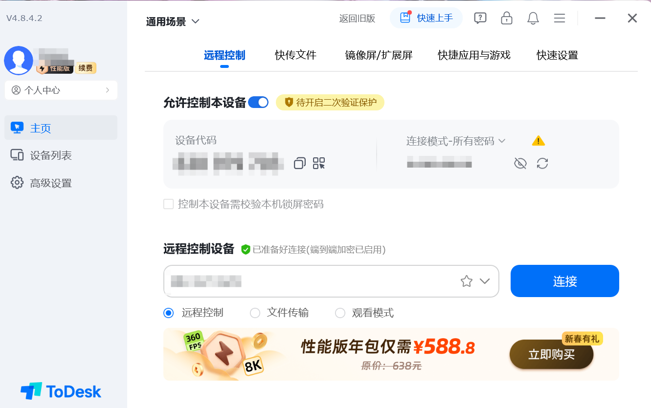 高性能和高画质是ToDesk最大的亮点。在付费版中,ToDesk支持最高8K分辨率和360FPS帧率,这在远程控制软件中是绝无仅有的。实测中,即使在远程控制应用多开的情况下,画面依然清晰流畅,色彩还原度极高。