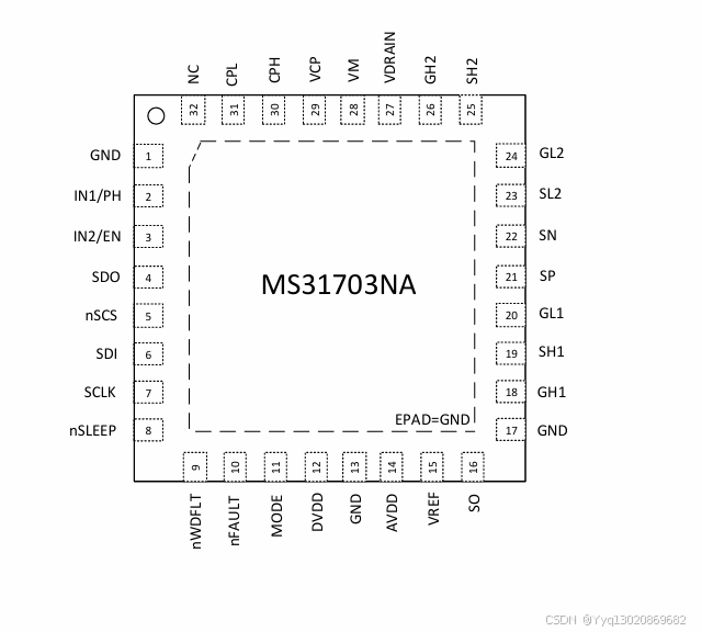 MS31703NA 是一款小型单通道 H 桥栅极驱动 器。它使用四个外部 N 通道 MOSFET,驱动一个双 向刷式直流电机。 PH/EN、独立半桥或 PWM 允许轻松连接到控制 器电路。内部传感放大器提供可调的电流控制。集 成的电荷泵可提供 100% 占空比,而且可用于驱动 外部反向电池开关。 独立半桥模式支持半桥共享,能够控制多个直 流电机。MS31703NA 内置相应的电路,能够使用固 定关断时间的PWM电流斩波来调节绕组电流。 MS31703NA 可以通过可编程压摆率控制技术, 降低电磁干扰 (EMI),可以灵活应用,而且可以防止 任何栅极短路问题。