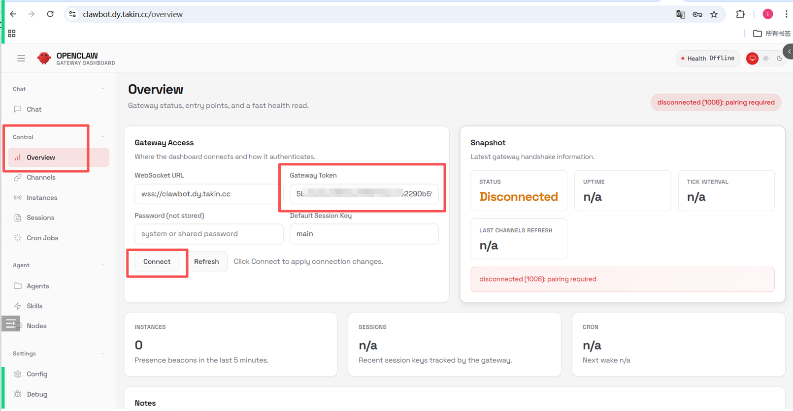 此时,可以将openclaw dashboard命令后显示的token粘贴到Control/Overview页面对应位置处