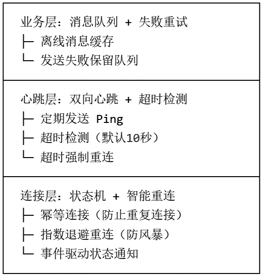 我们的 WebSocketClient 采用连接层-心跳层-业务层的三层防御设计: