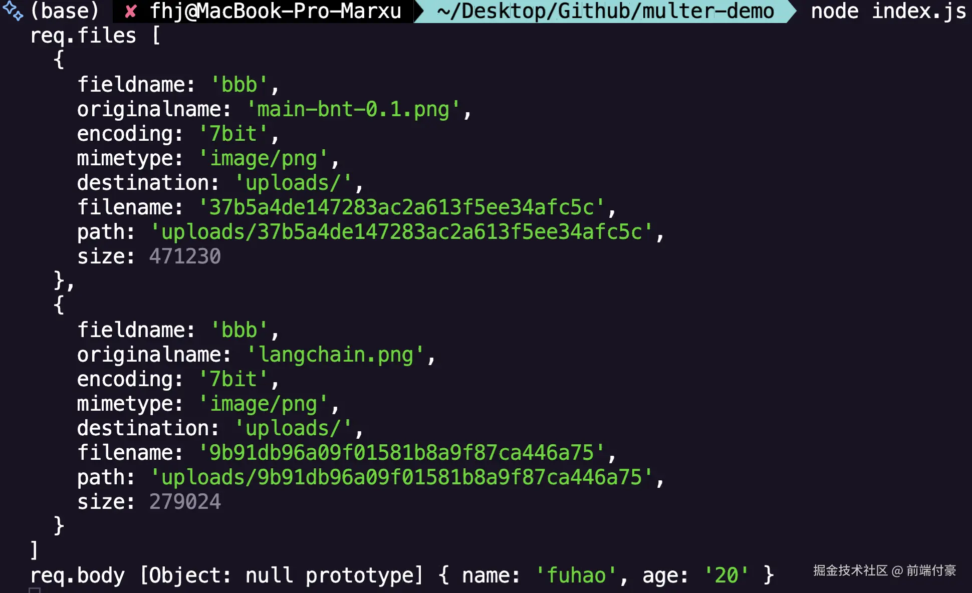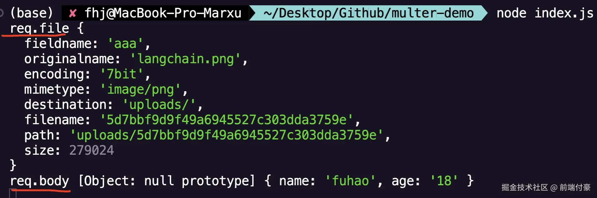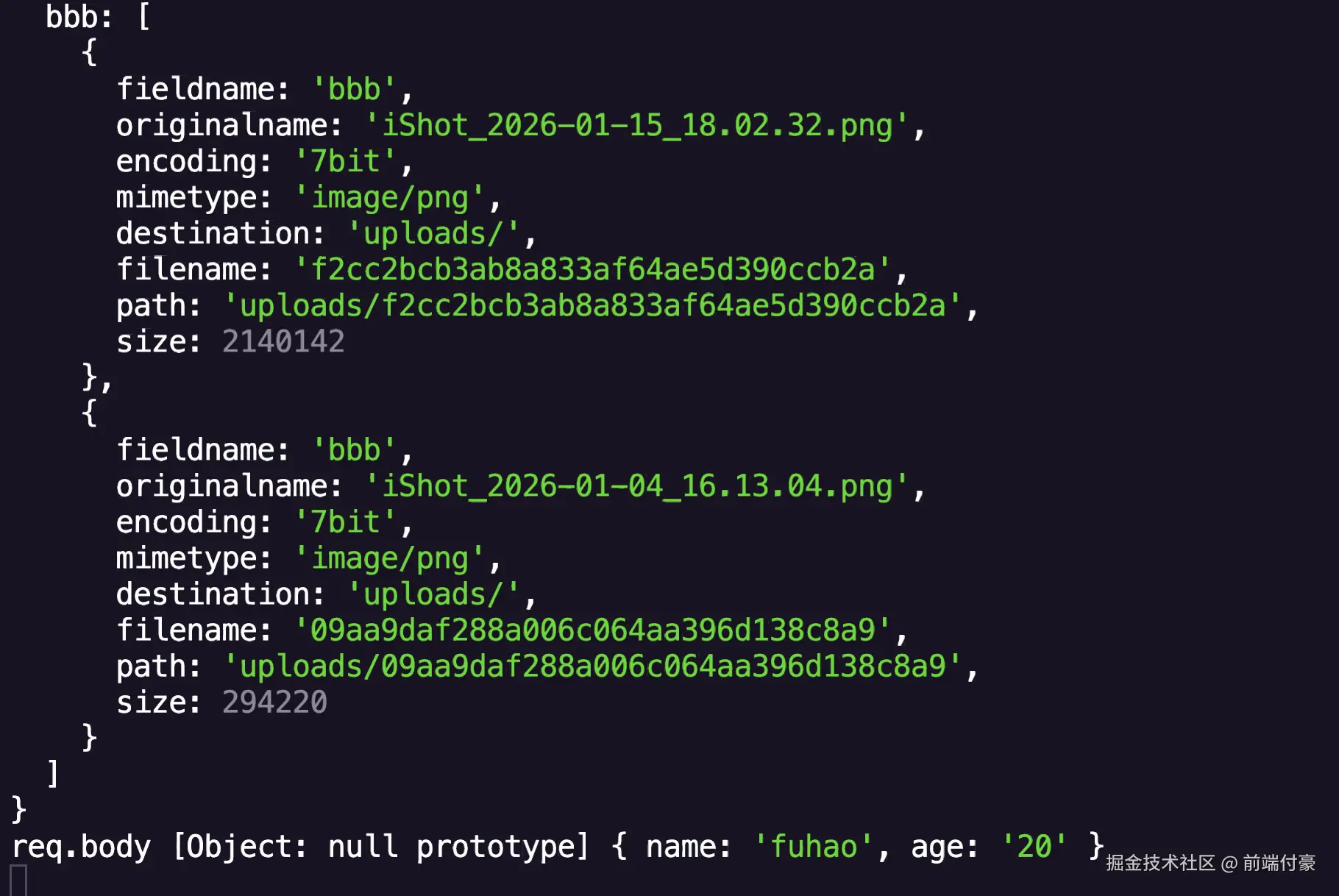 req.file 拿到文件字段,非文件字段在 req.body