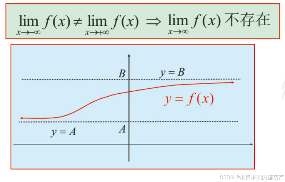 推论 如果 limx→−∞f(x)≠limx→+∞f(x)\lim_{x\rightarrow-\infty} f(x)\neq\lim_{x\rightarrow+\infty} f(x)limx→−∞f(x)=limx→+∞f(x) 或至少有一个不存在,