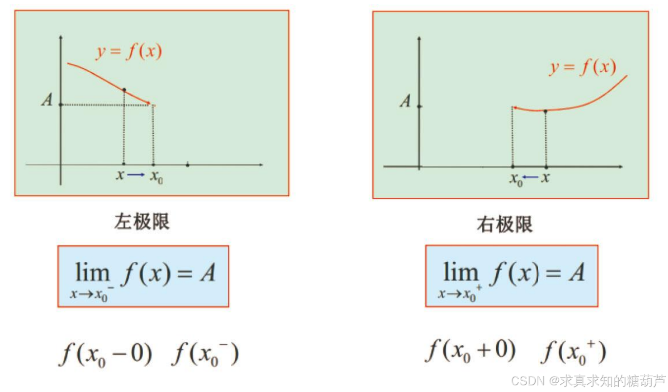 记作 limx→x0−f(x)=A\lim_{x\rightarrow x_0^{-}} f(x)=Alimx→x0−f(x)=A 或 f(x0−)=Af(x_0^{-})=Af(x0−)=A (也可记作 f(x0−0)=Af(x_0-0)=Af(x0−0)=A)。