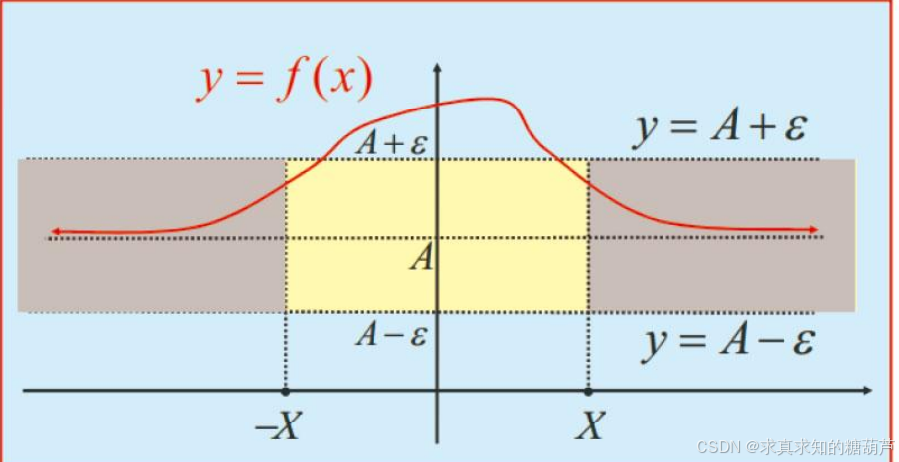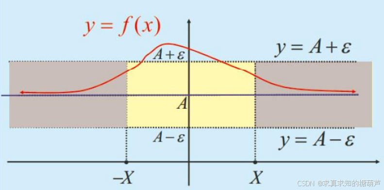则当 ∣x∣>X|x|>X∣x∣>X 时,就有 ∣f(x)−A∣<ε|f(x)-A|<\varepsilon∣f(x)−A∣<ε。