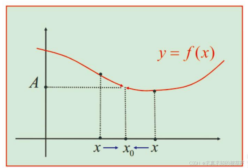 极限 limx→x0f(x)=A\lim_{x\rightarrow x_0} f(x)=Alimx→x0f(x)=A 是双侧极限,即 xxx 从 x0x_0x0 的两侧趋于 x0x_0x0 时,函数 f(x)f(x)f(x) 以 AAA 为极限。