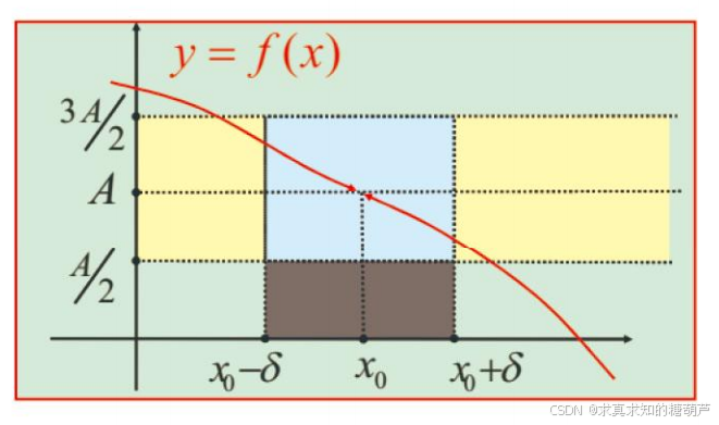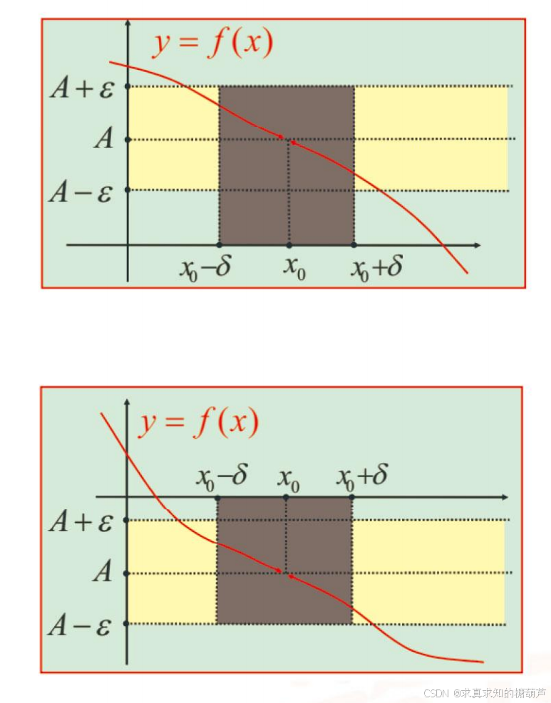 即 ∀ε>0,∃δ>0,∀x∈(x0−δ,x0)∪(x0,x0+δ)⇒A−ε<f(x)<A+ε\forall\varepsilon>0,\exists\delta>0,\forall x\in(x_0-\delta, x_0)\cup(x_0, x_0+\delta)\Rightarrow A-\varepsilon<f(x)<A+\varepsilon∀ε>0,∃δ>0,∀x∈(x0−δ,x0)∪(x0,x0+δ)⇒A−ε<f(x)<A+ε。