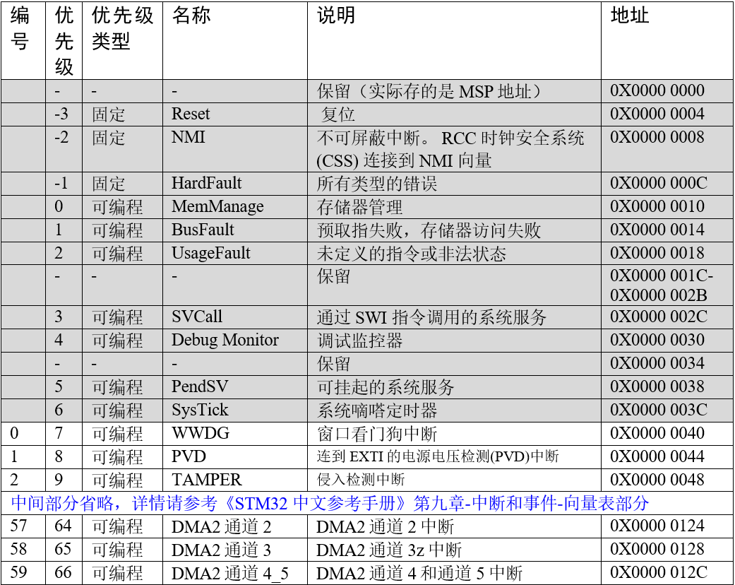 向量表从FLASH的0地址开始放置,以4个字节为一个单位,地址0存放的是栈顶地址,0X04存放的是复位程序的地址,以此类推。
