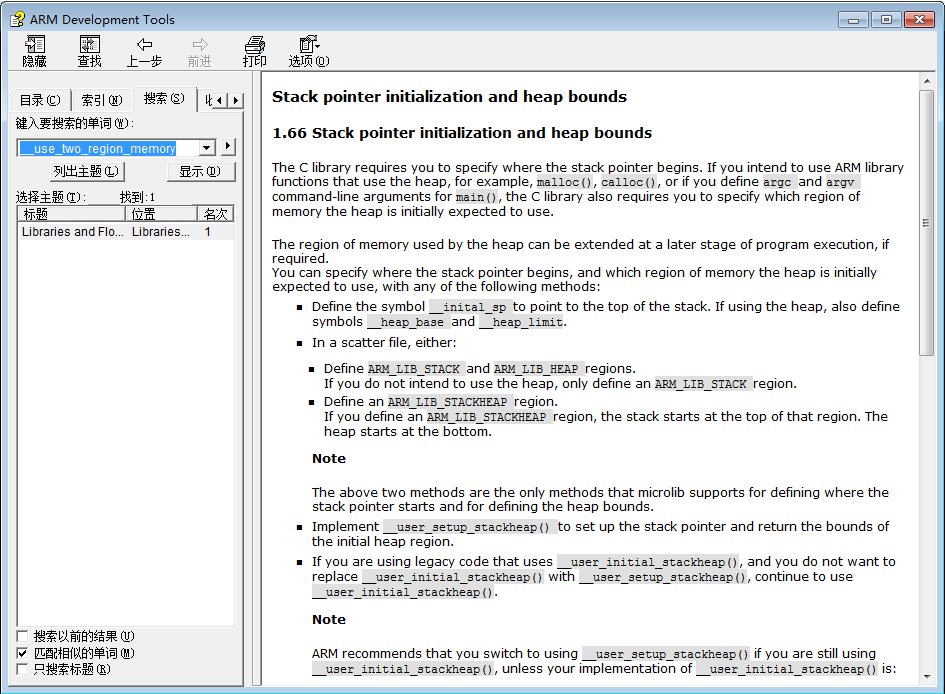 如果没有定义__MICROLIB,则插入标号__use_two_region_memory,这个函数需要用户自己实现, 具体要实现成什么样,可在KEIL的帮助文档里面查询到, 具体见图 use_two_region_memory函数。