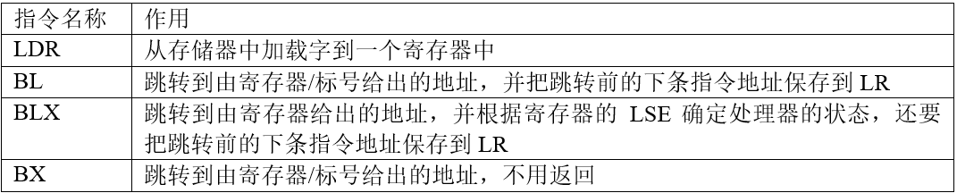 LDR、BLX、BX是CM4内核的指令,可在《CM3权威指南CnR2》第四章-指令集里面查询到,具体作用见下表: