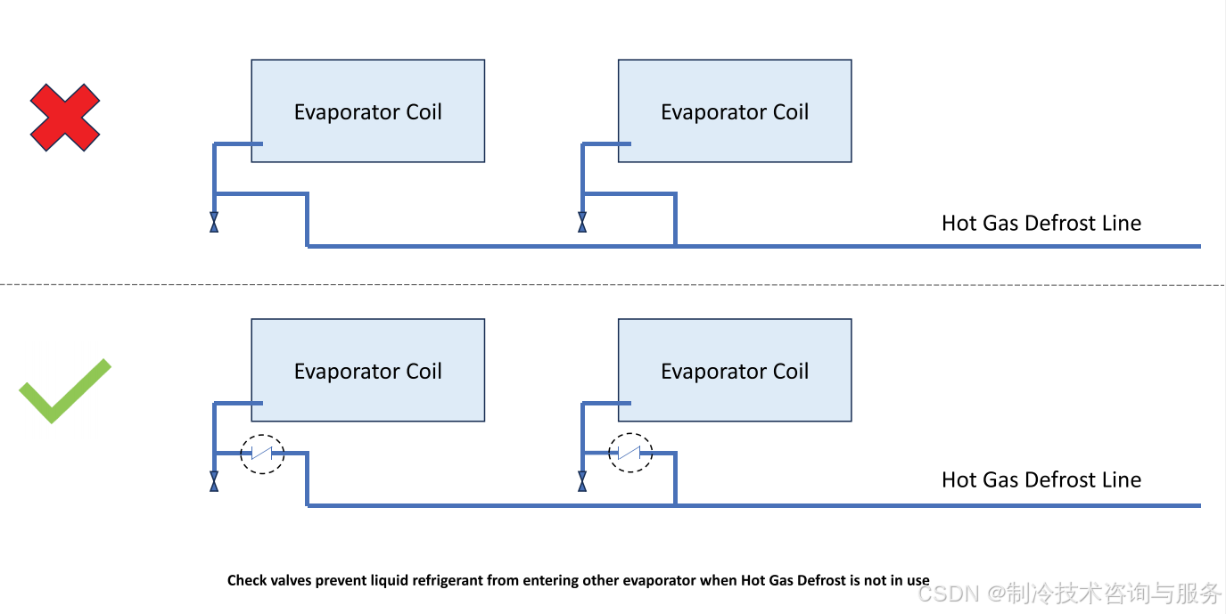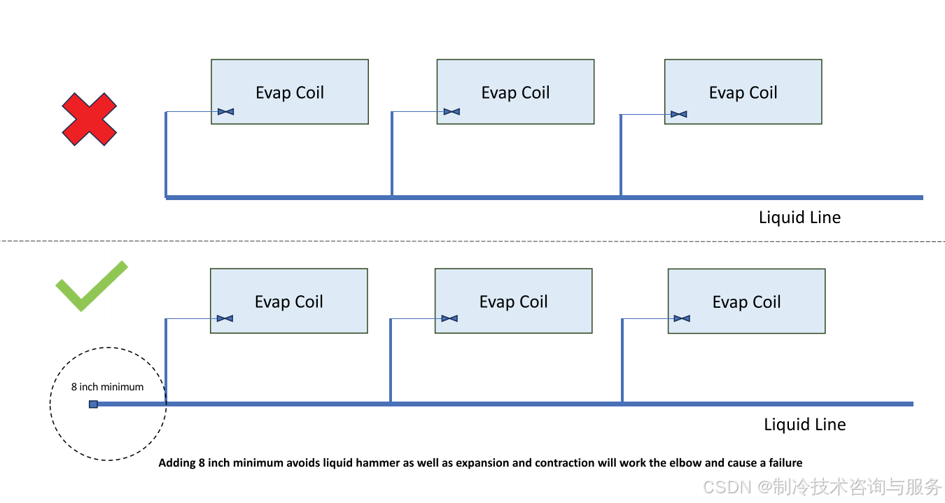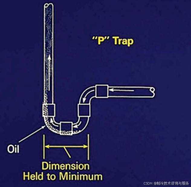 每隔10-15英尺安装"P"型或"U"型存水弯有助于在沿途暂时储存油,并防止油回流到蒸发器