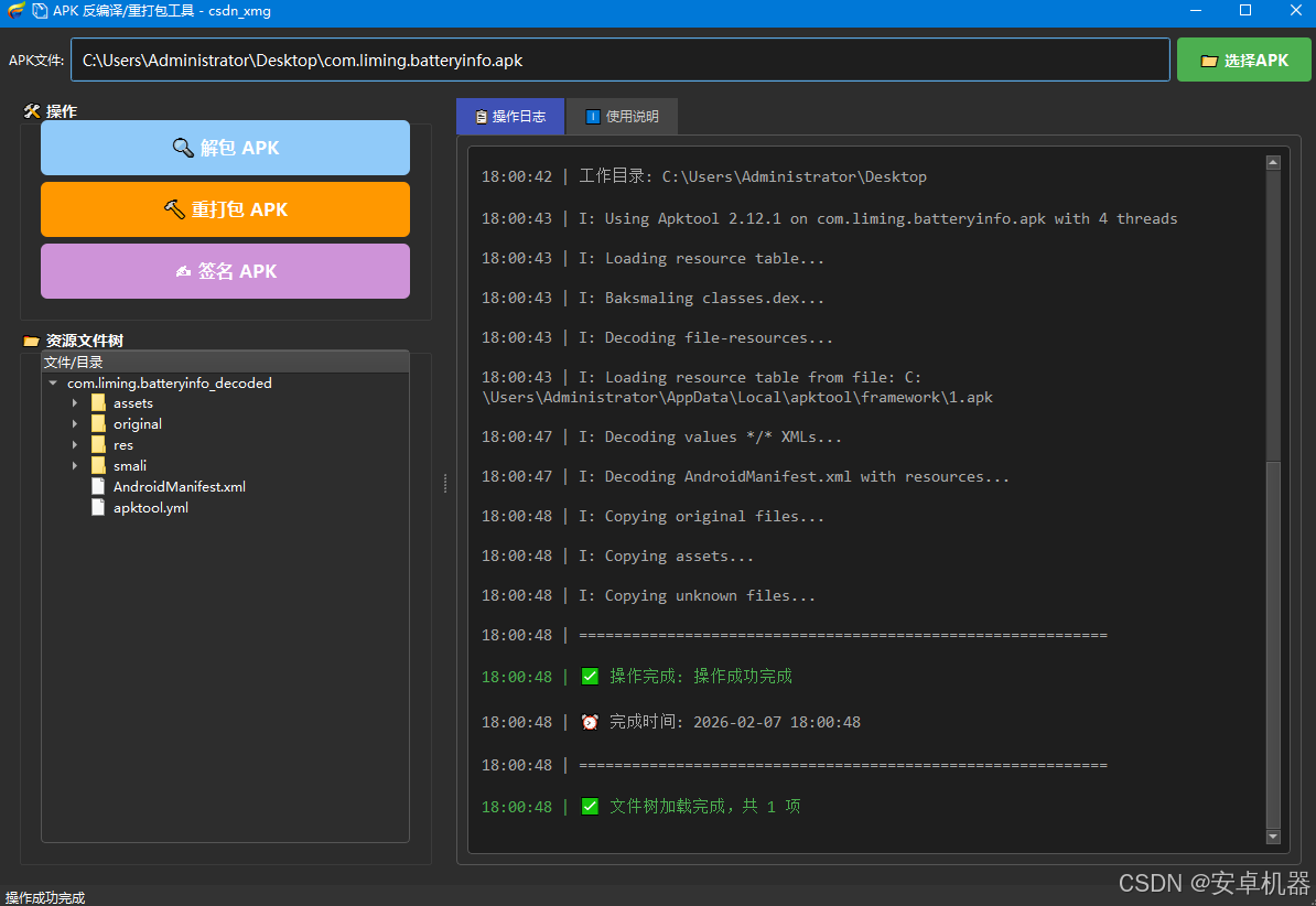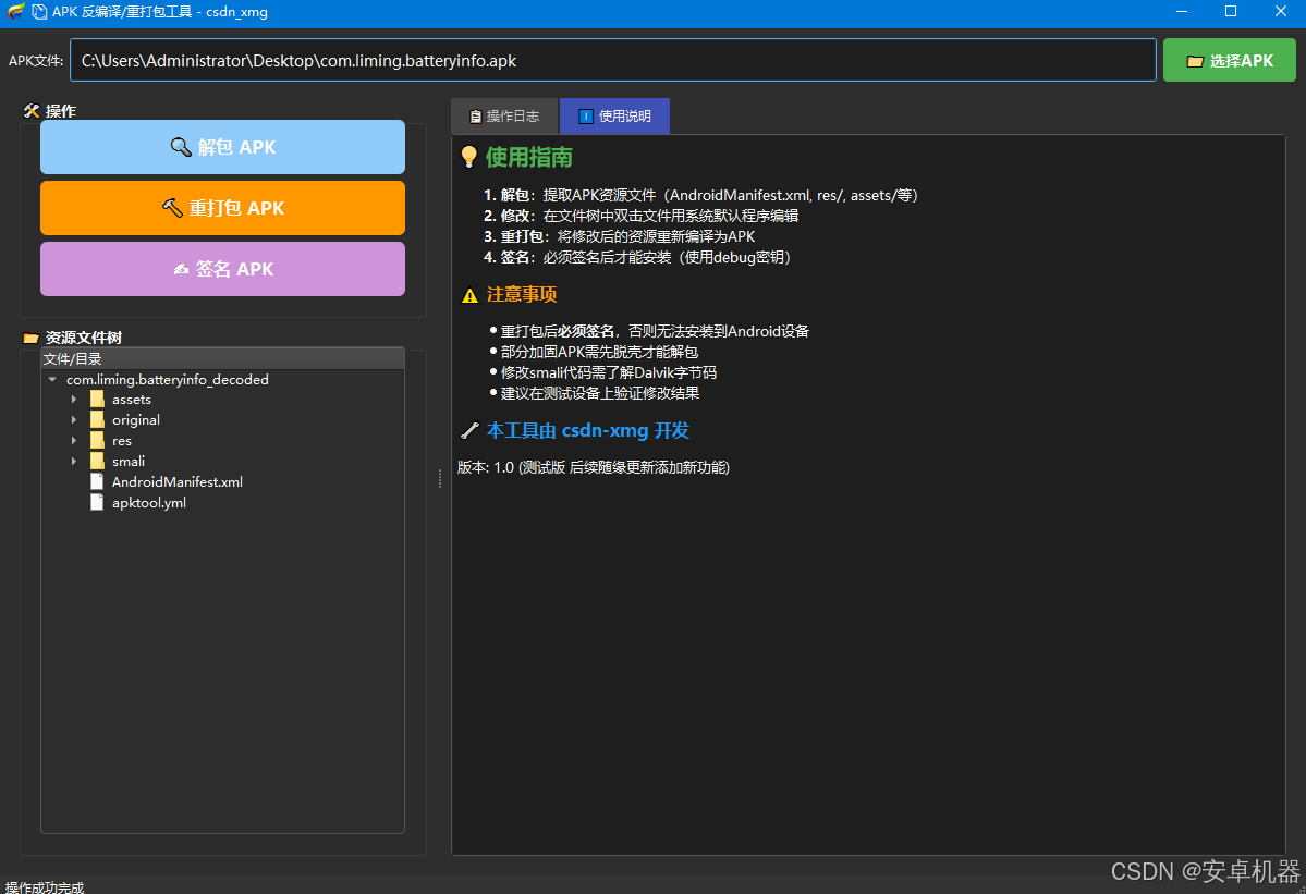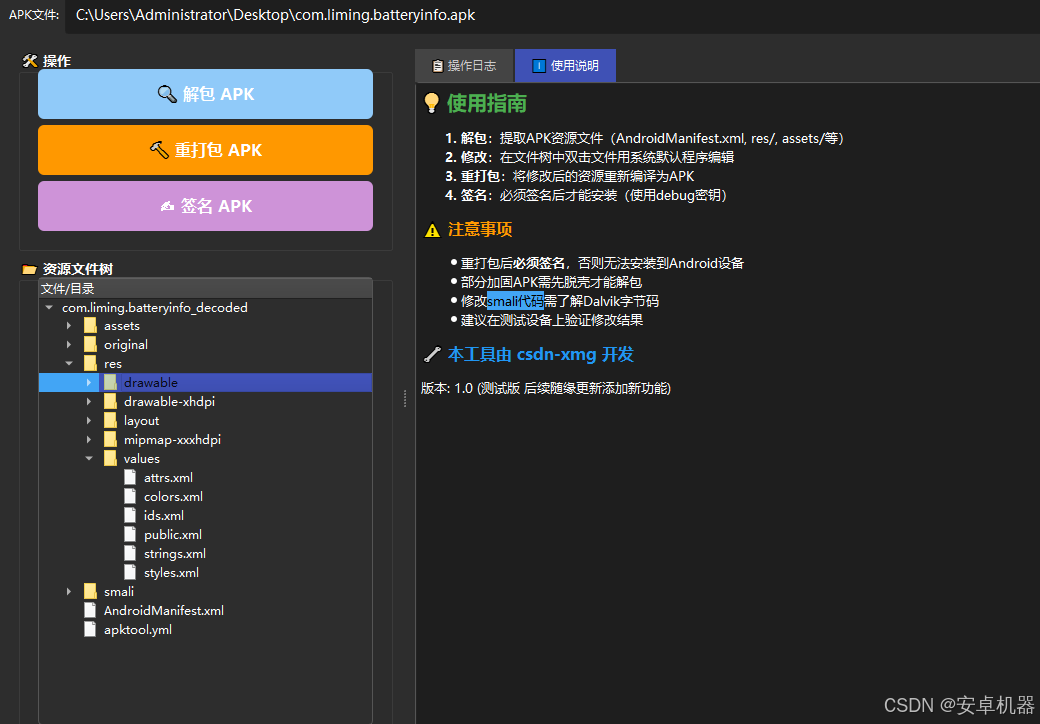 最近对python较感兴趣。手搓小工具。功能一般。用于查看一些应用代码 结构来说绰绰有余。不支持一些特殊apk应用。需要配置安装好java环境。操作前记得备份源文件。以免出错,
