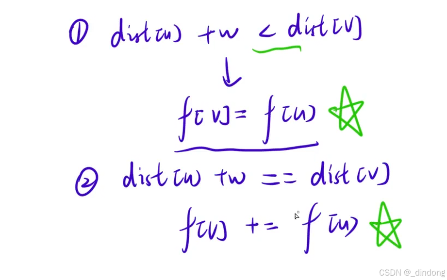首先我们得确保到达v的时候是最短路,所以如果遇到更短路径直接赋值,这时就是第一次遇到该节点(bfs),赋值直接更新路径条数即可,然后纳入队列。