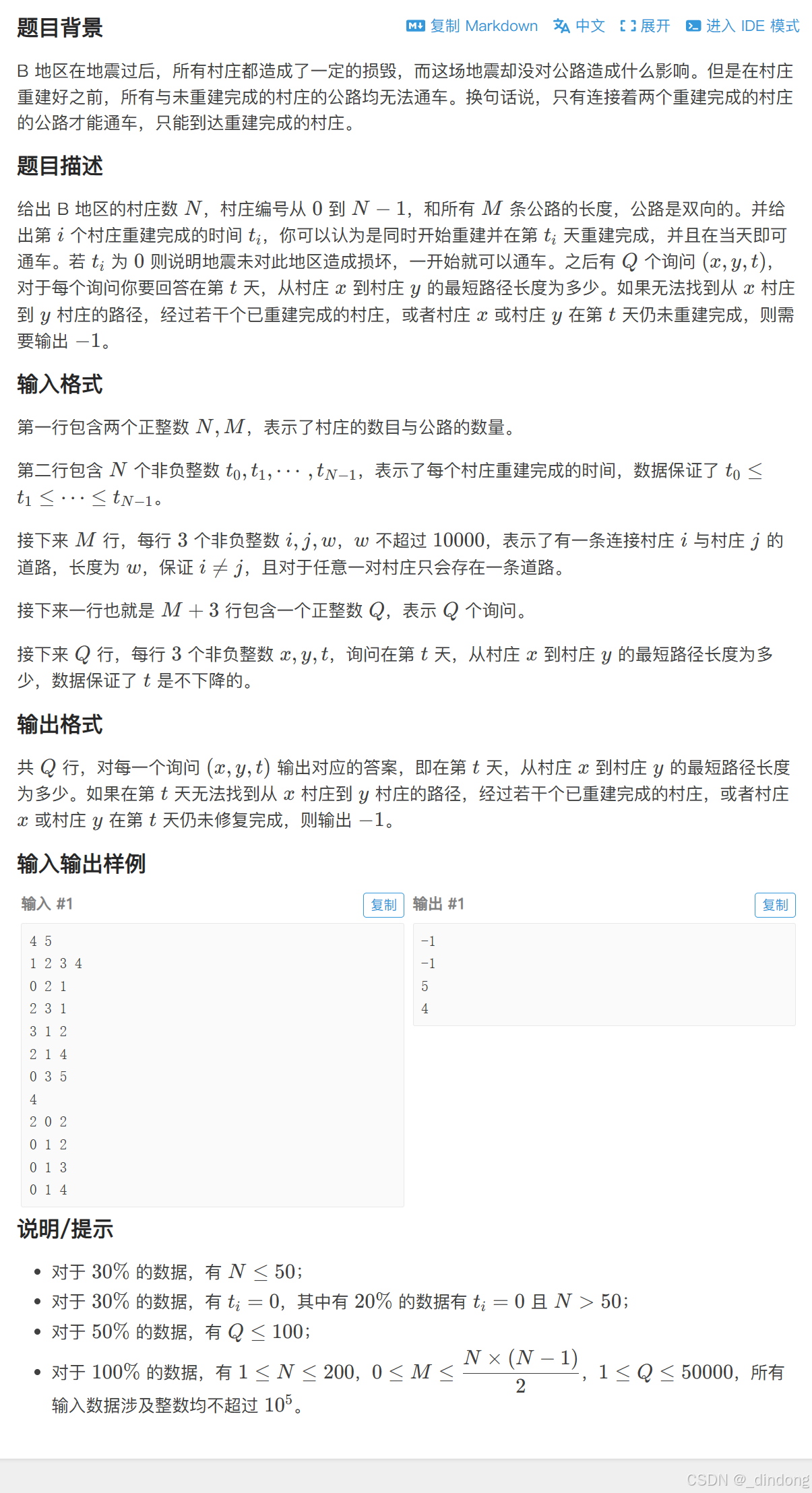 修复时间非递减 以及 询问t是不下降的保证了Floyd算法的可行,询问是t的就把修复时间小于等于t的点插入。