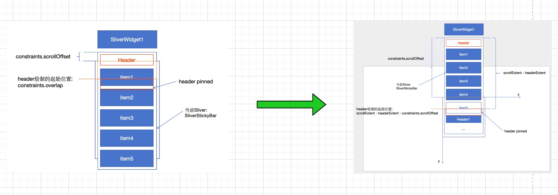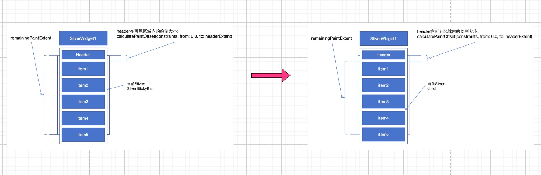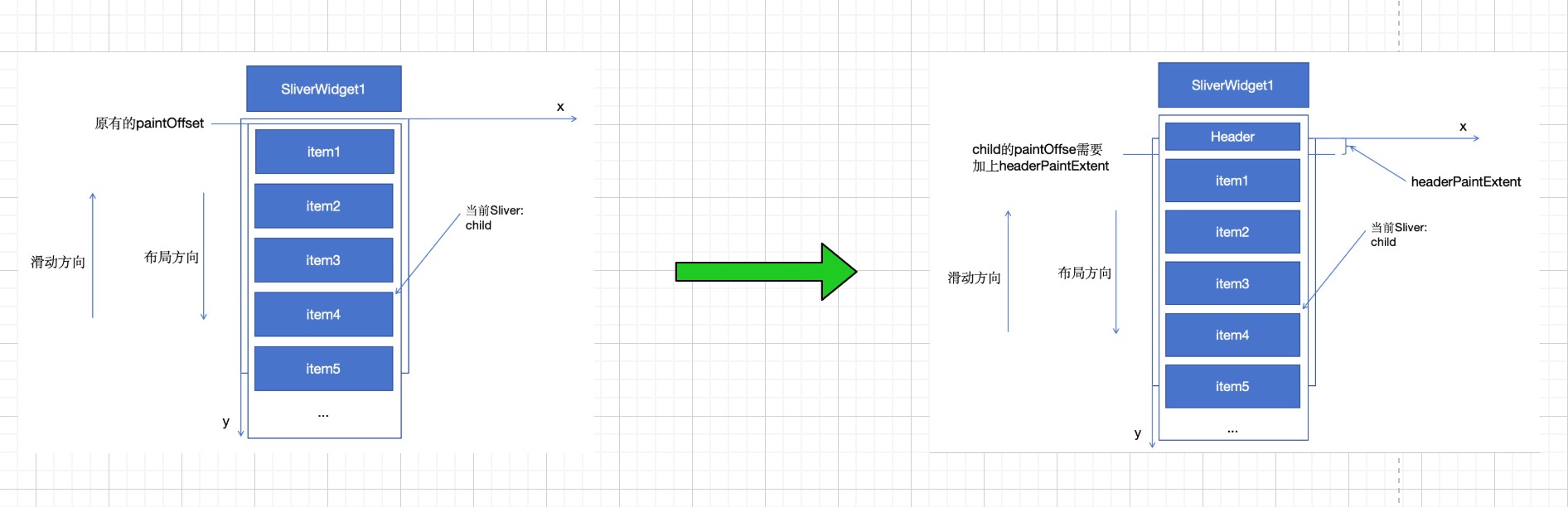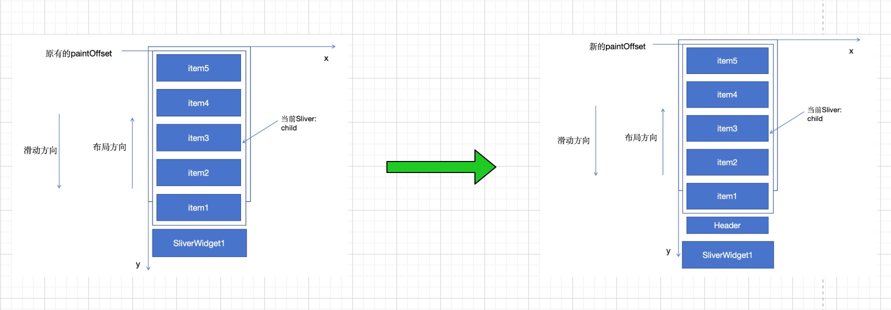 paint方法dart@override void paint(PaintingContext context, Offset offset) { if (geometry!.visible) { if (child != null && child!.geometry!.visible) { final childParentData = child!.parentData as SliverPhysicalParentData; context.paintChild(child!, offset + childParentData.paintOffset); } if(header != null) { final headerParentData = header!.parentData as SliverPhysicalParentData; context.paintChild(header!, offset + headerParentData.paintOffset); } } }