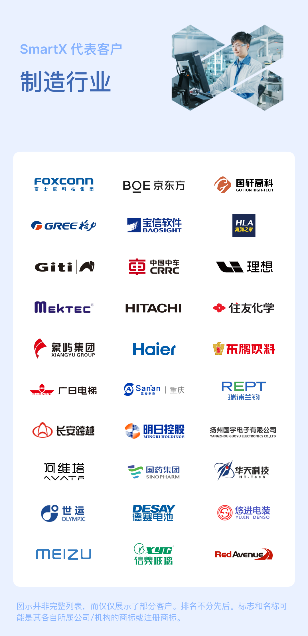 截至 2025 年底,志凌海纳 SmartX 已帮助 600+ 中高端 制造行业用户,基于榫卯企业云平台等产品线加速 IT 基础设施现代化建设,不仅承载核心业务系统、支持多厂区灾备建设与统一管理、实现 VMware/Nutanix 替代、支持开发测试/VDI 环境,还以边缘云加速标准化工厂建设,并构建覆盖从总部到分支工厂的全栈企业云平台,确保生产就绪与业务连续性。