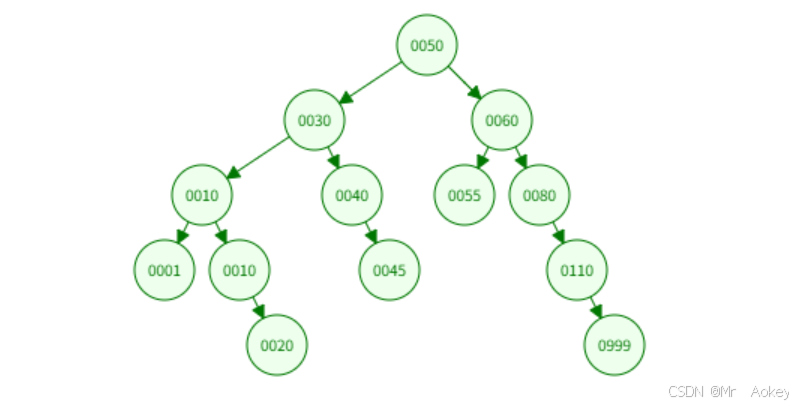 二叉搜索树的中序遍历是一个有序数组,所以其支持范围查找,但是如下图。如果按序插入( 0050、0060、0080、0110、0999 )后,该二叉搜索树就退化成了一个单边树,时间复杂度为 O ( N ),在数据检索过程中,每次访问节点的子节点都会触发磁盘I/O操作。由于I/O操作是整个数据库系统的性能瓶颈,减少I/O次数能显著提升系统性能。