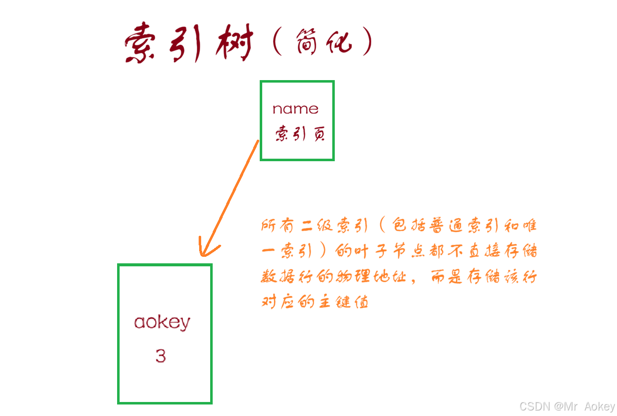 比如我们查询 Id 、name 和 sno 的话,name列的普通索引树中的叶子节点中只含有 name 和 Id ,没有 sno 的数据,就会返回 aokey 对应的主键值,再去主键索引树查询完整的数据并返回,这种情况叫做回表查询