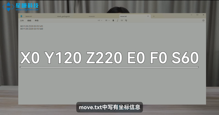 move.txt中写有坐标信息: XYZ三轴的坐标,E滑轨的坐标,F为轴运行速度,S为舵机的角度。 运行代码,机械臂会按照move.txt文件中的内容进行运动。