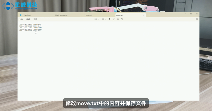 修改move.txt中的内容,再运行代码,机械臂会按照move.txt文件中的新内容进行运动。