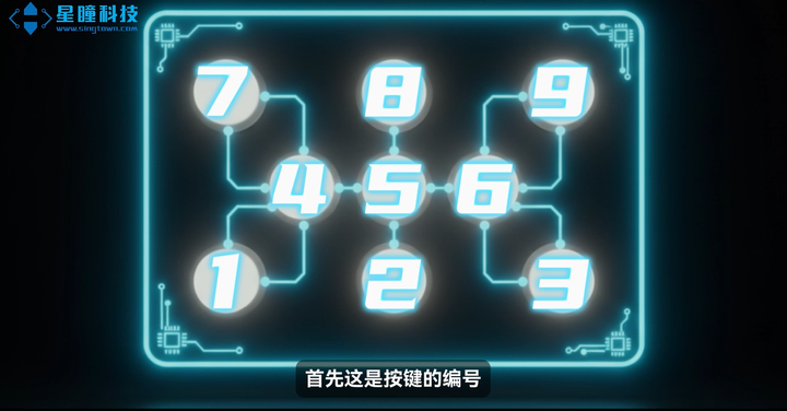 按键编号如图,功能如下:按键8-右转,按键2-左转,按键4-前移,按键6-后移,按键3-下移,按键9-上移,按键7-打开夹爪,按键1-闭合夹爪,按键5-单击保存、双击运行。